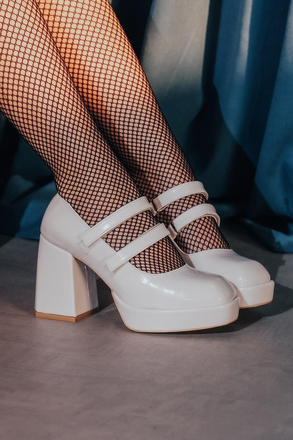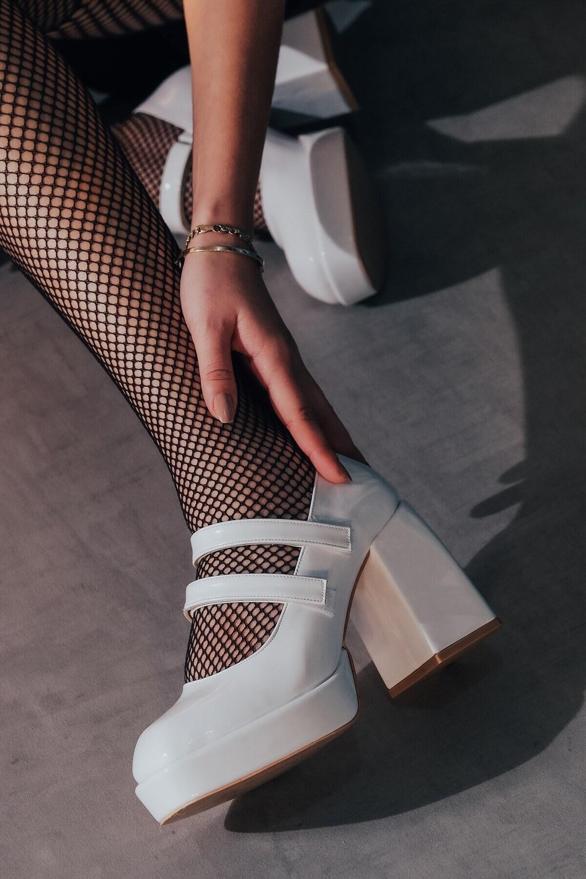 Beyaz Rugan Çift Cırtlı Kadın Platform Topuklu Ayakkabı Girona Beyaz Rugan