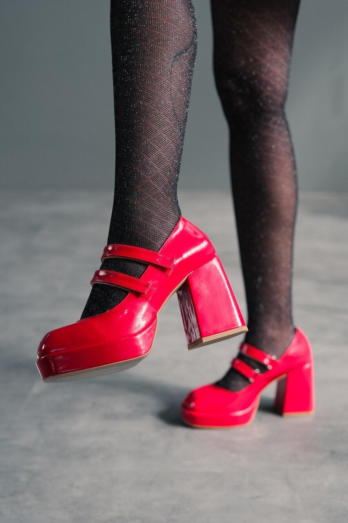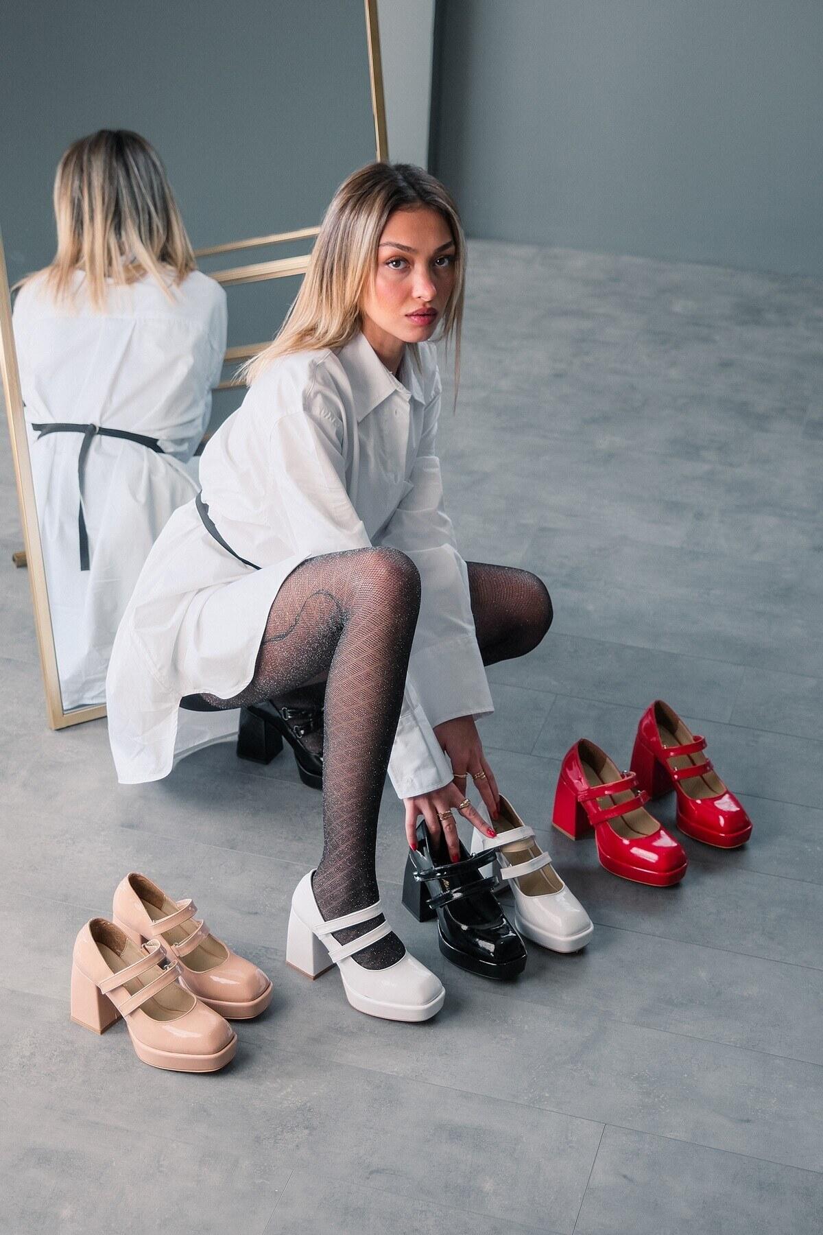 Beyaz Rugan Çift Cırtlı Kadın Platform Topuklu Ayakkabı Girona Kırmızı Rugan