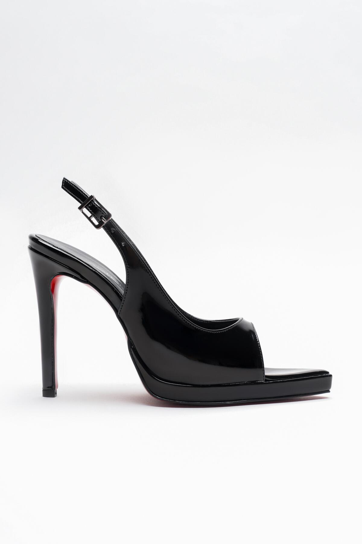 Kadın Arka Açık Sivri Burun İnce Topuklu Platform Ayakkabı Hari Siyah Rugan