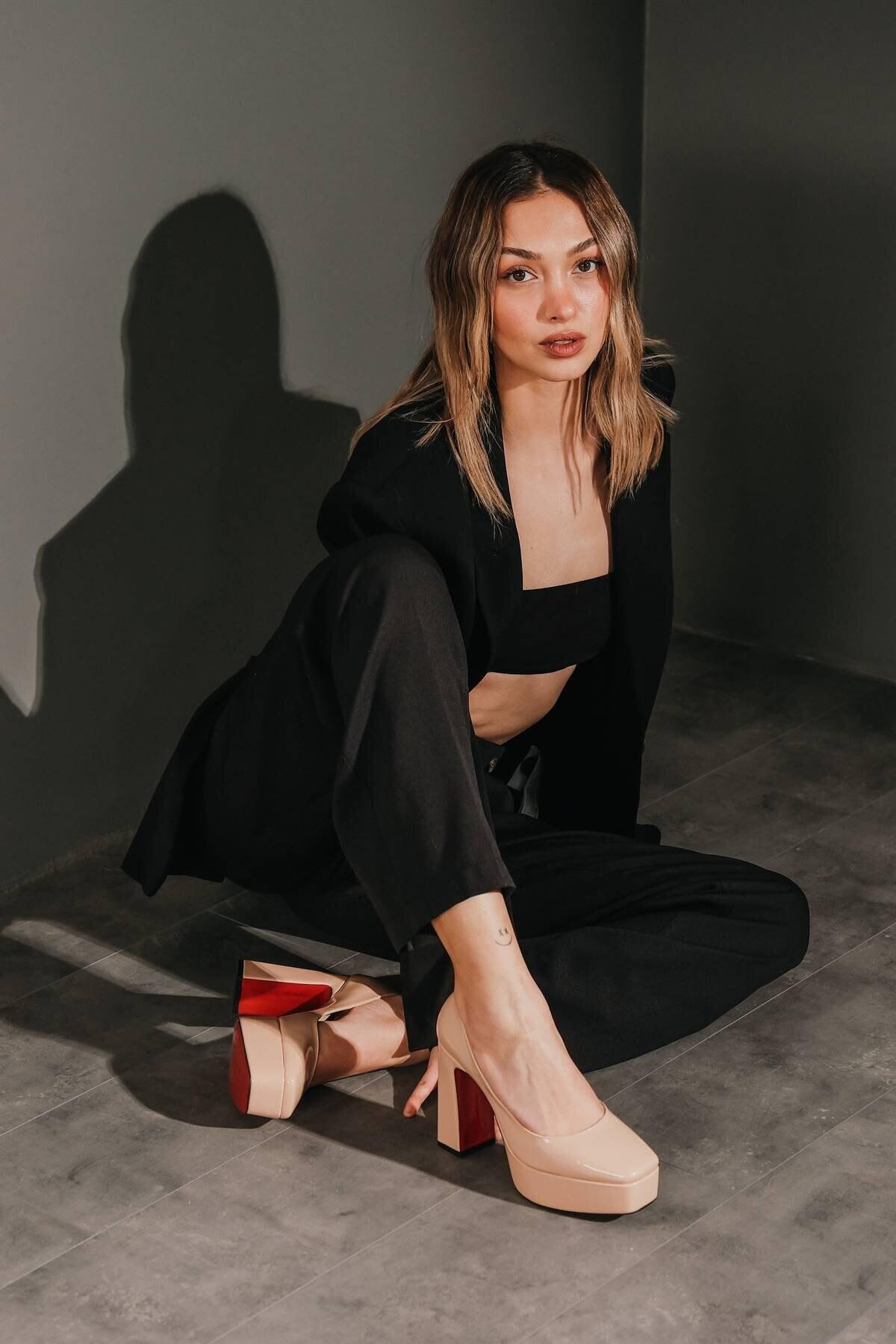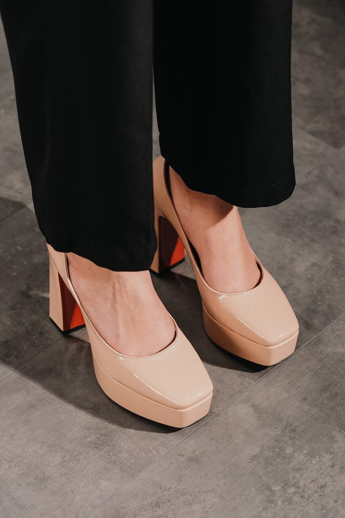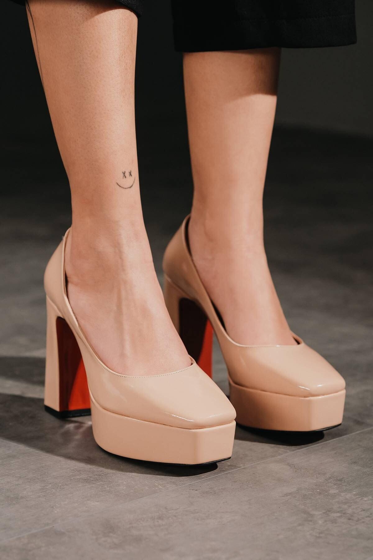 Kadın Platform Tasarım Toka Detaylı Orta Topuklu Ayakkabı Chelsea Nude Rugan