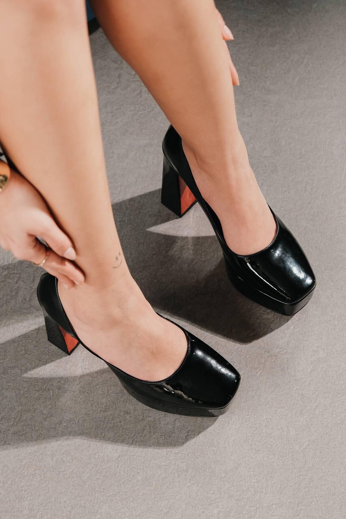 Kadın Platform Tasarım Toka Detaylı Orta Topuklu Ayakkabı Chelsea Siyah Rugan