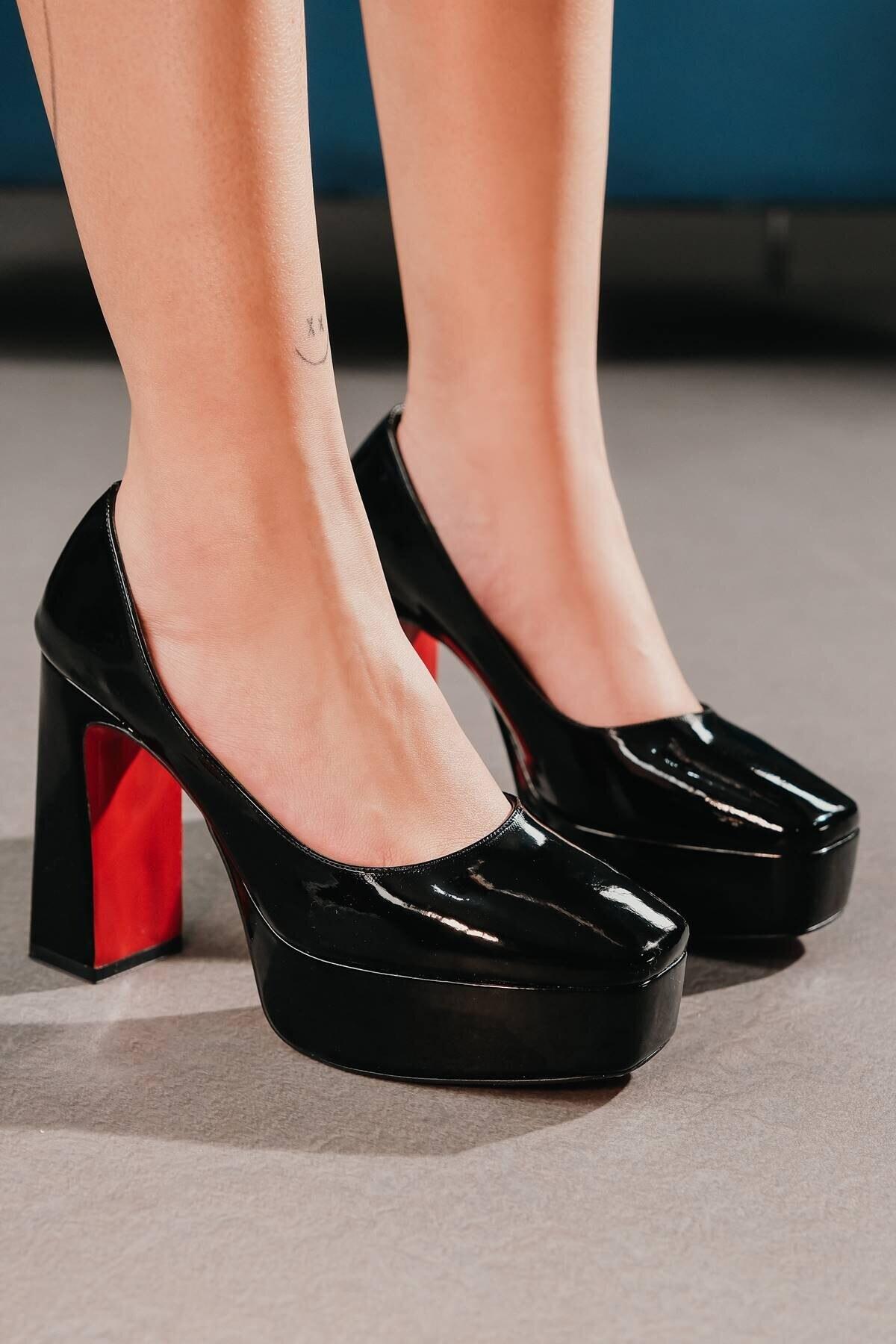 Kadın Platform Tasarım Toka Detaylı Orta Topuklu Ayakkabı Chelsea Siyah Rugan