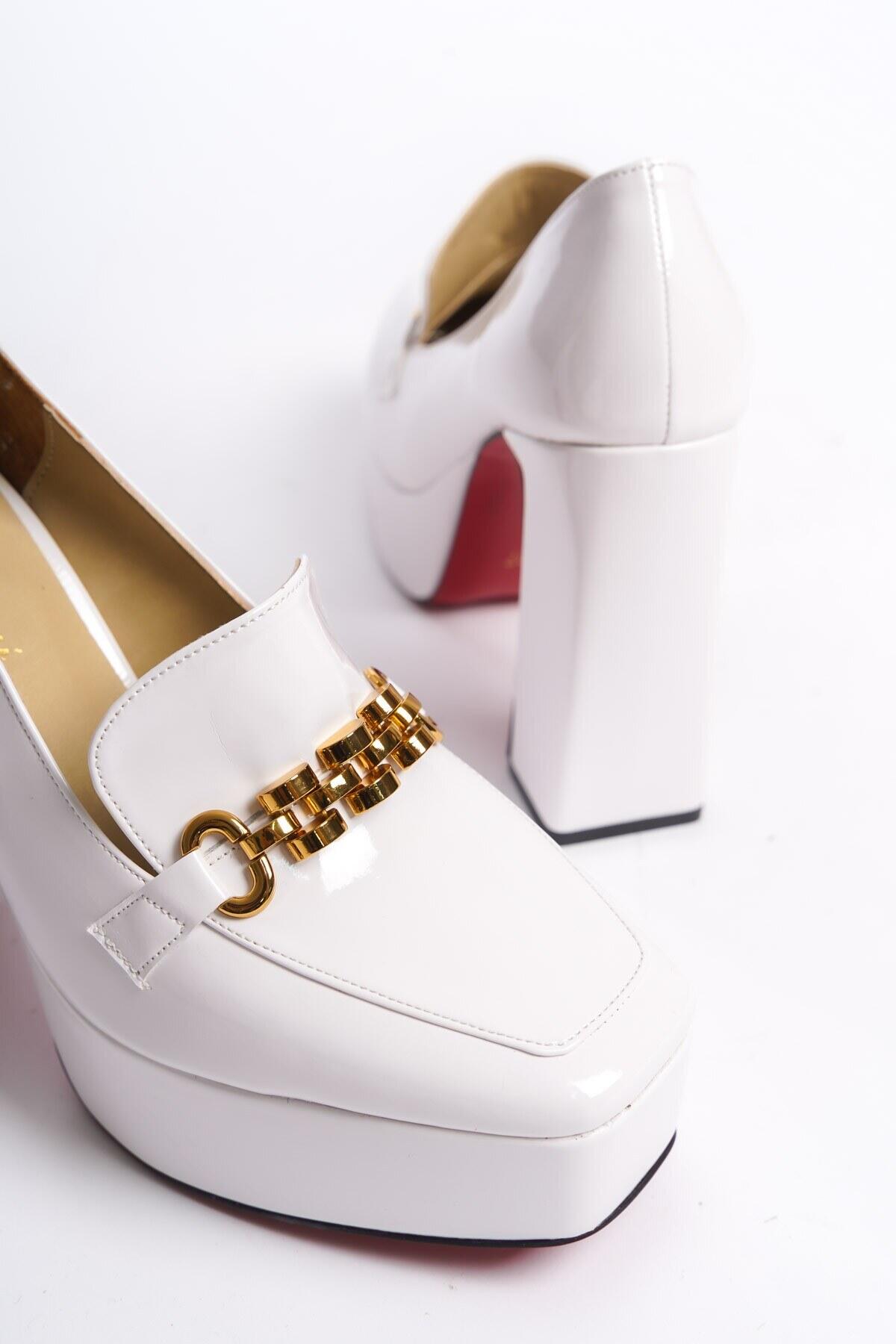 Kadın Platform Tasarım Toka Detaylı Orta Topuklu Ayakkabı Vanera Beyaz Rugan