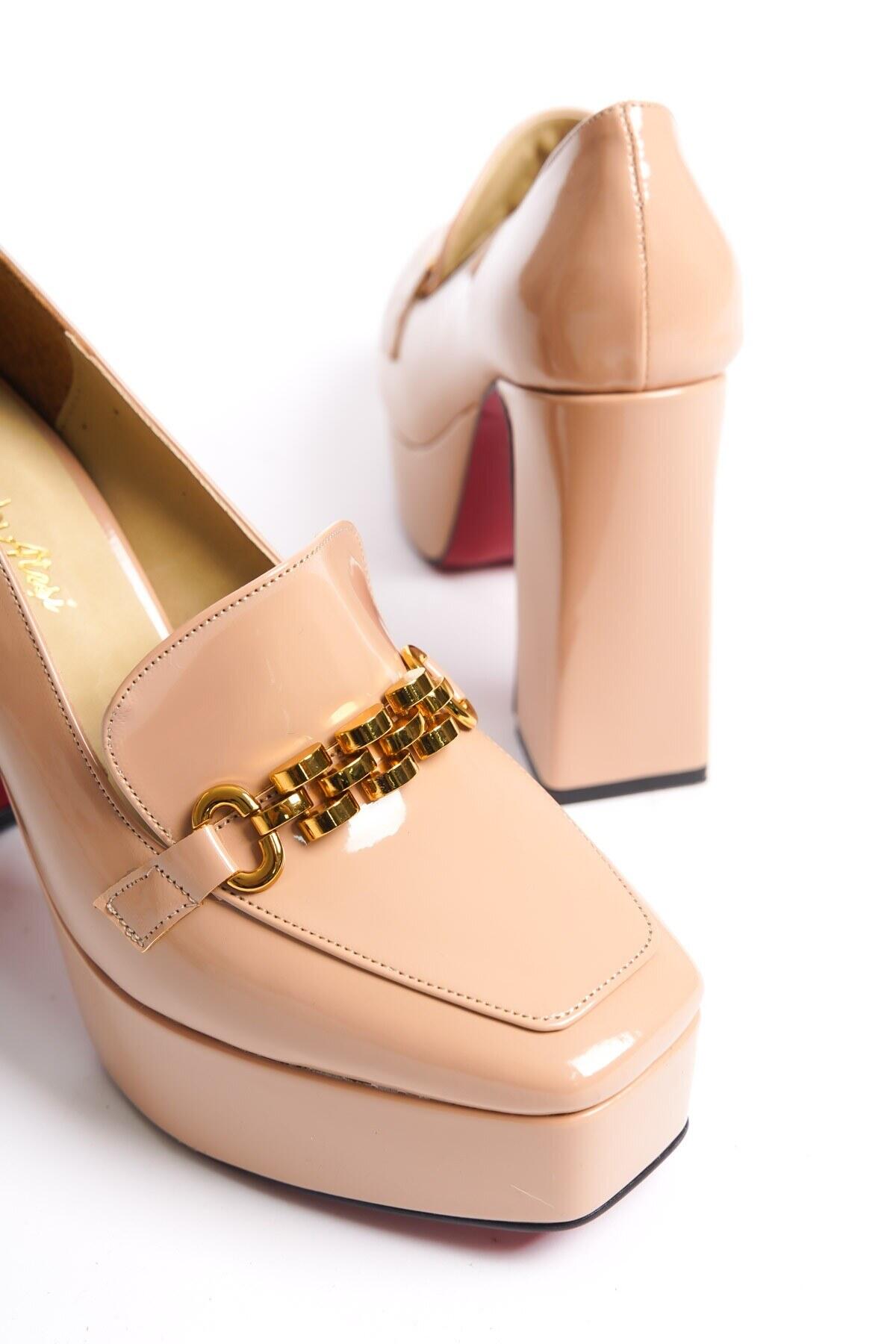 Kadın Platform Tasarım Toka Detaylı Orta Topuklu Ayakkabı Vanera Nude Rugan