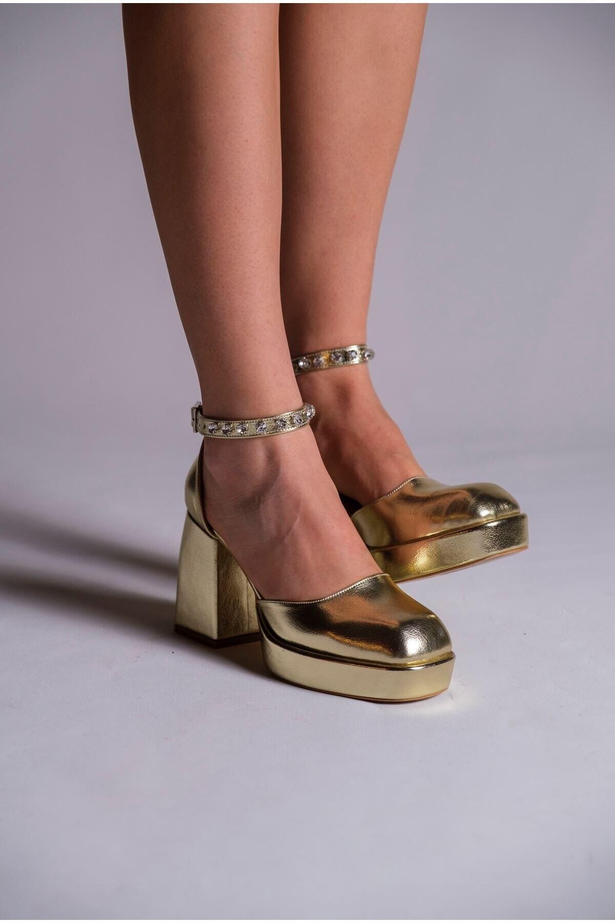 Kadın Taş Detaylı Özel Tasarım Alçak Topuklu Ayakkabısı Sandy Altın