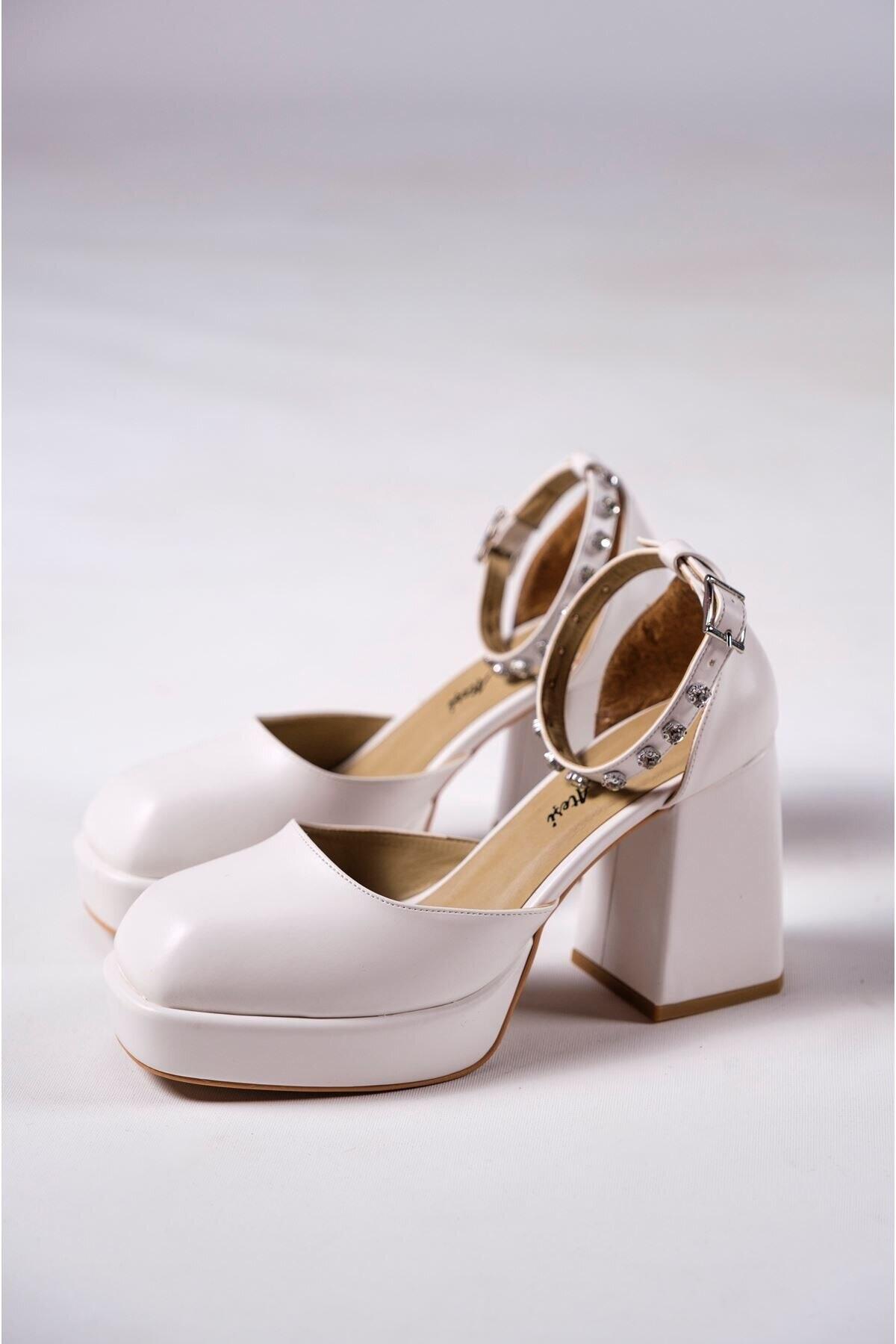 Kadın Taş Detaylı Özel Tasarım Alçak Topuklu Ayakkabısı Sandy Beyaz Cilt