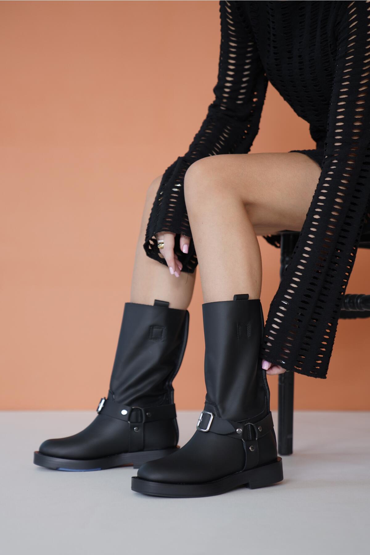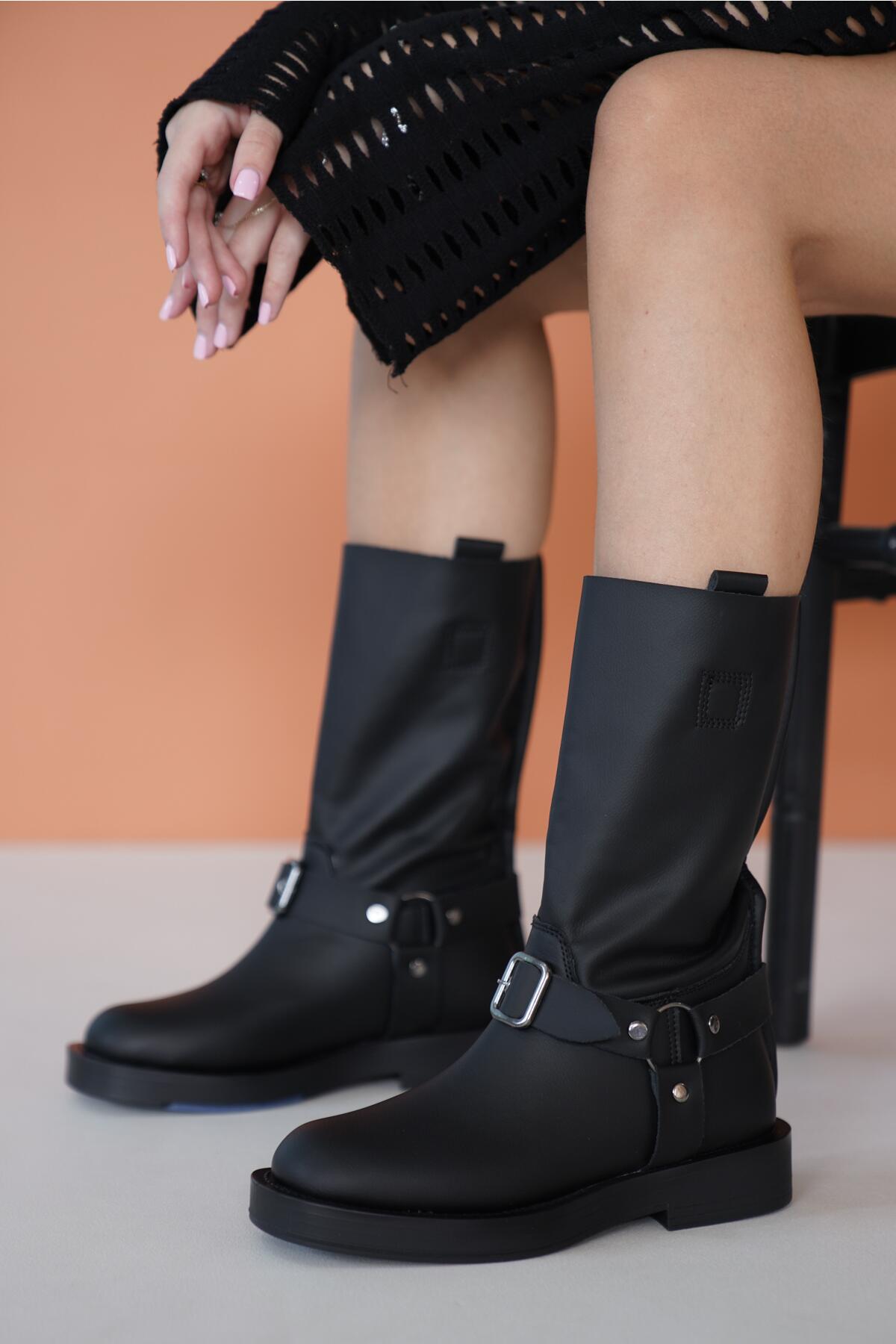 Kadın Toka Detaylı Streç Düz Bot Borin Siyah