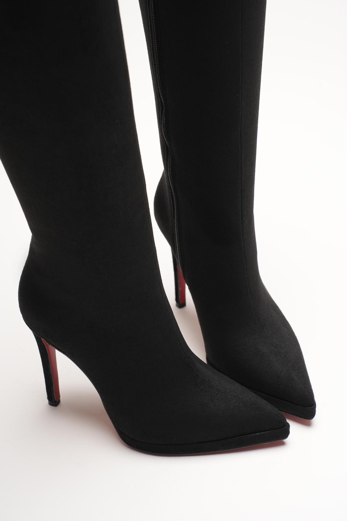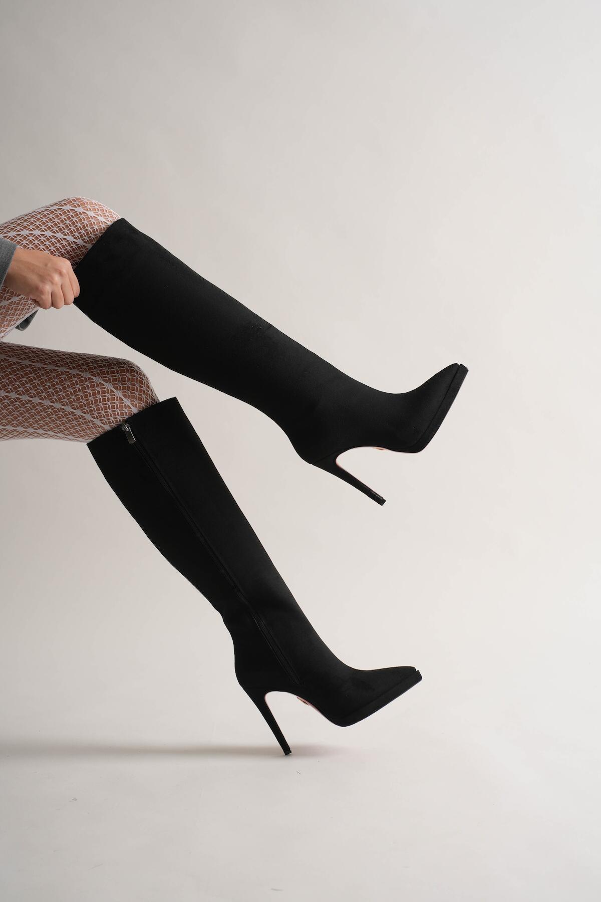 Kadın Diz Altı Kısa Platform Topuklu Çizme Amazen Siyah Süet