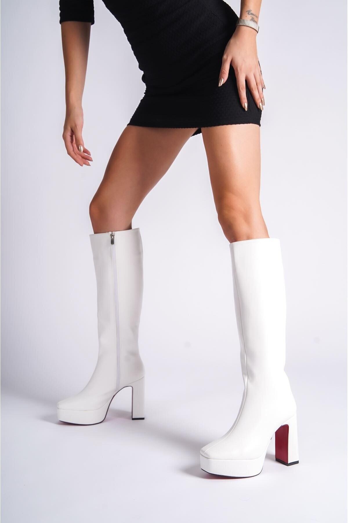 Kadın Platform Diz Altı Çizme Paman Beyaz Cilt