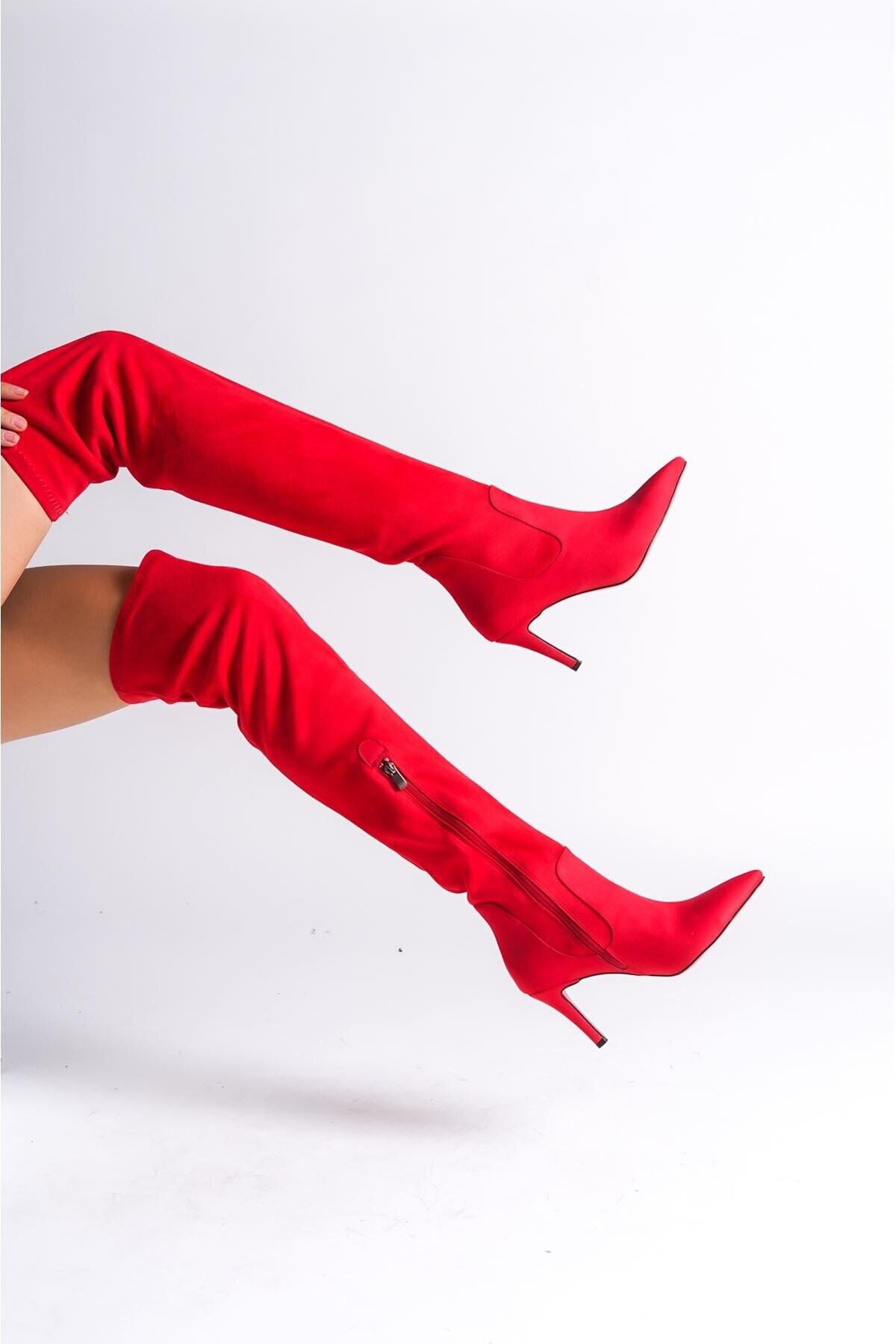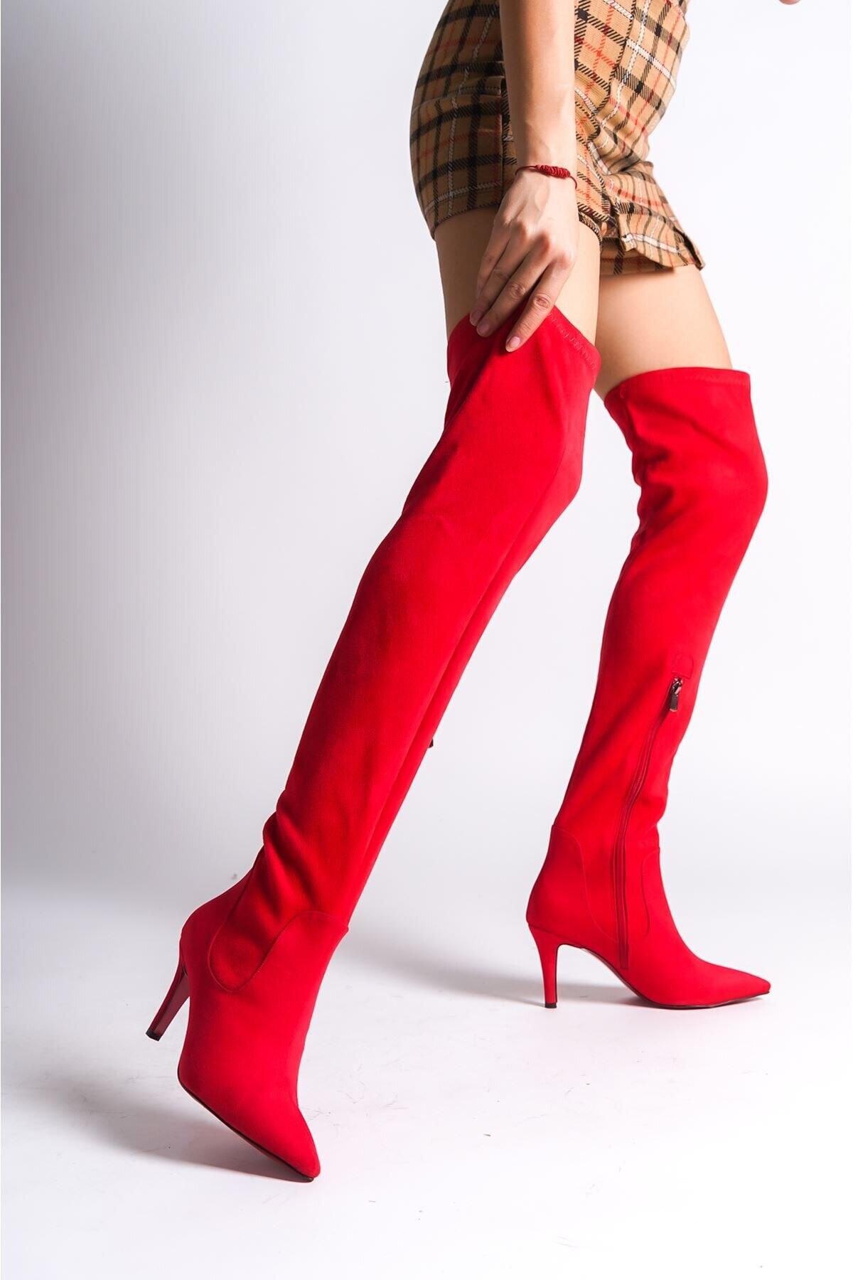 Kadın Yarım Fermuarlı Diz Üstü Streç Çizme Born Kırmızı Süet