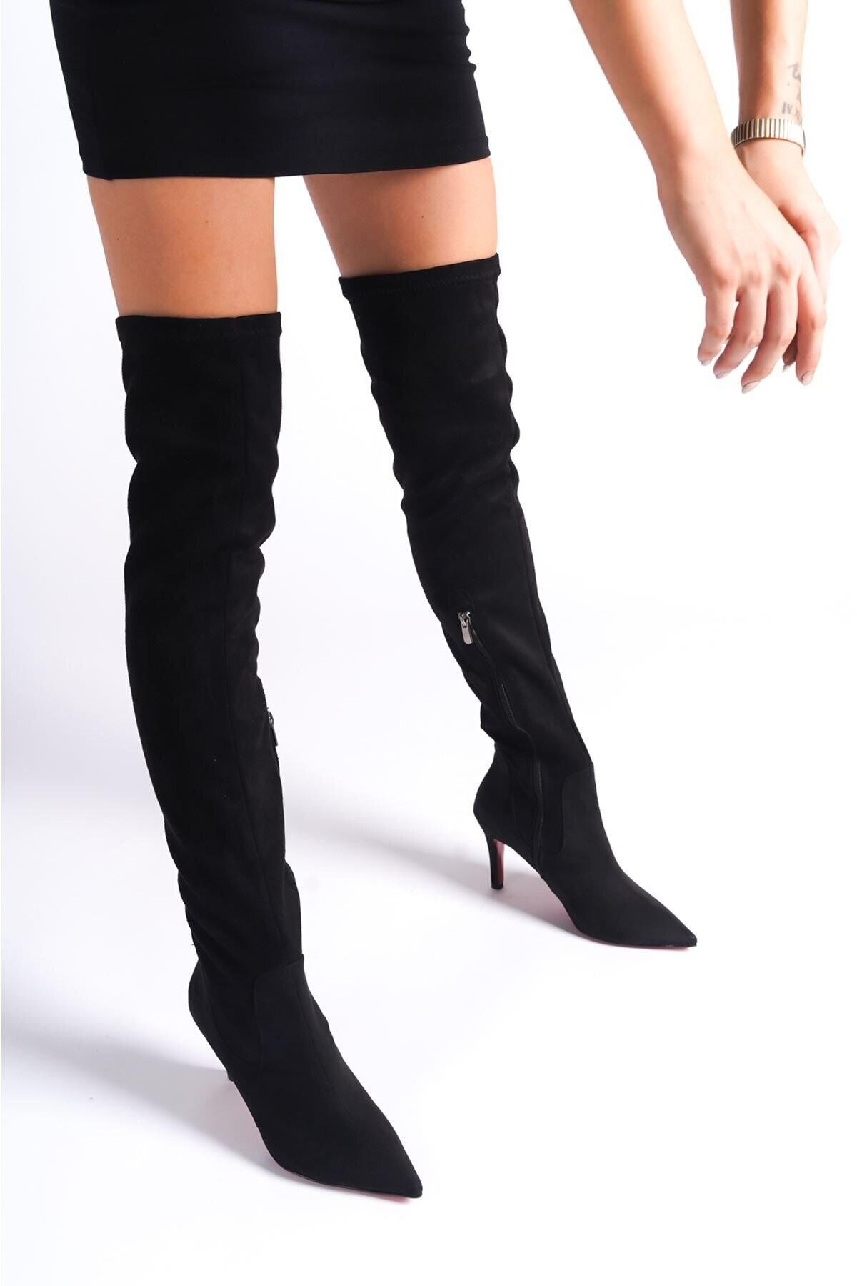 Kadın Yarım Fermuarlı Diz Üstü Streç Çizme Born Siyah Süet
