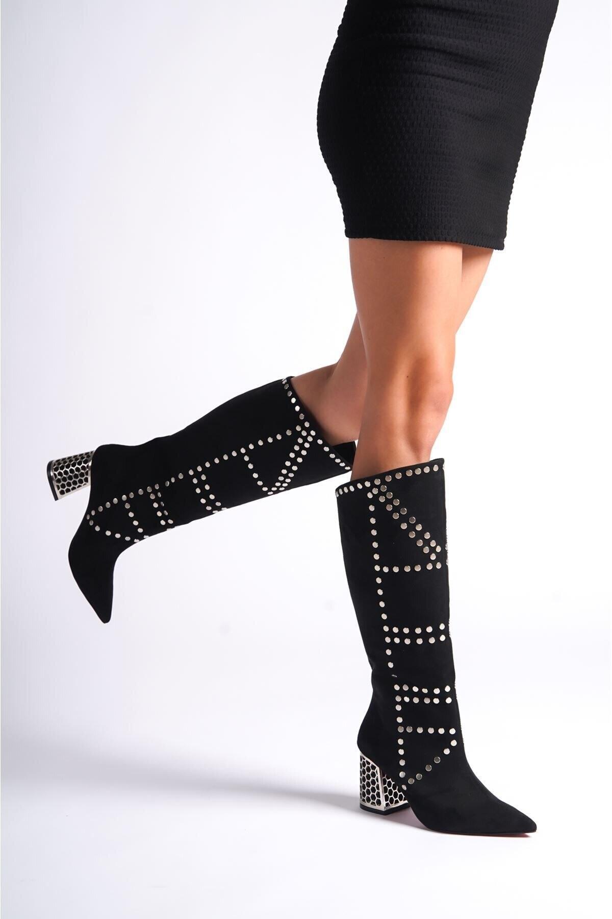 Kadın Zımbalı Tasarım Kısa Topuklu Çizme Lotus Siyah Cilt