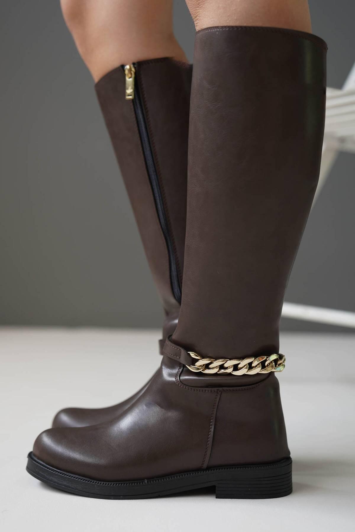 Kadın Zincir Tokalı Düz Çizme Kloria Kahverengi