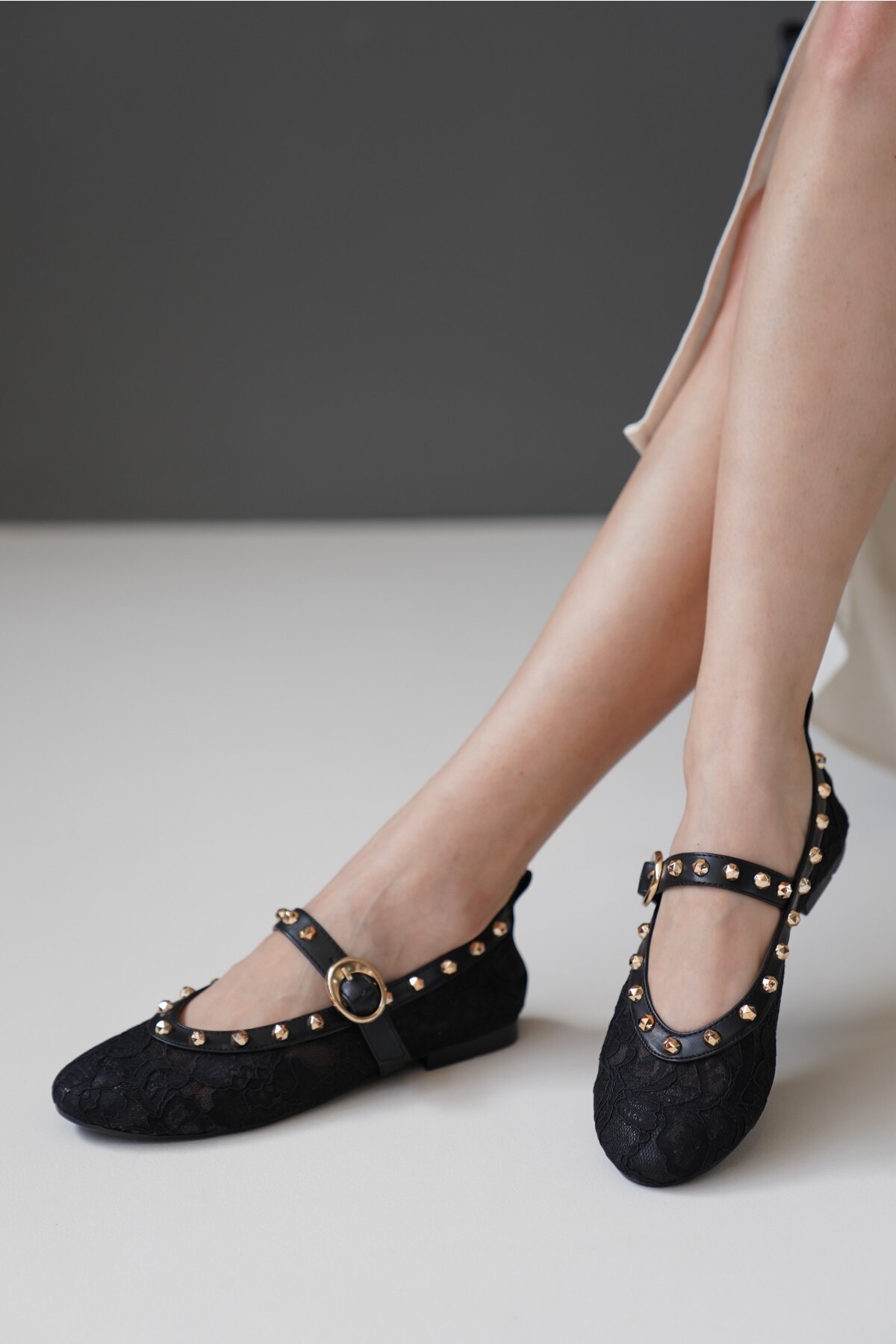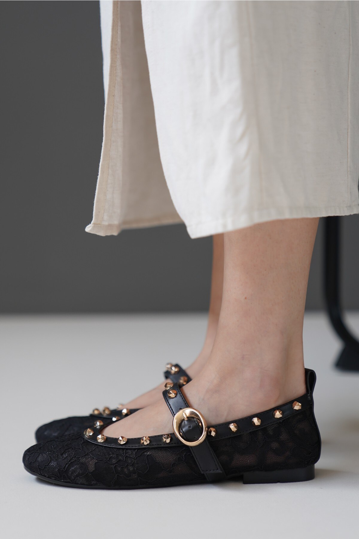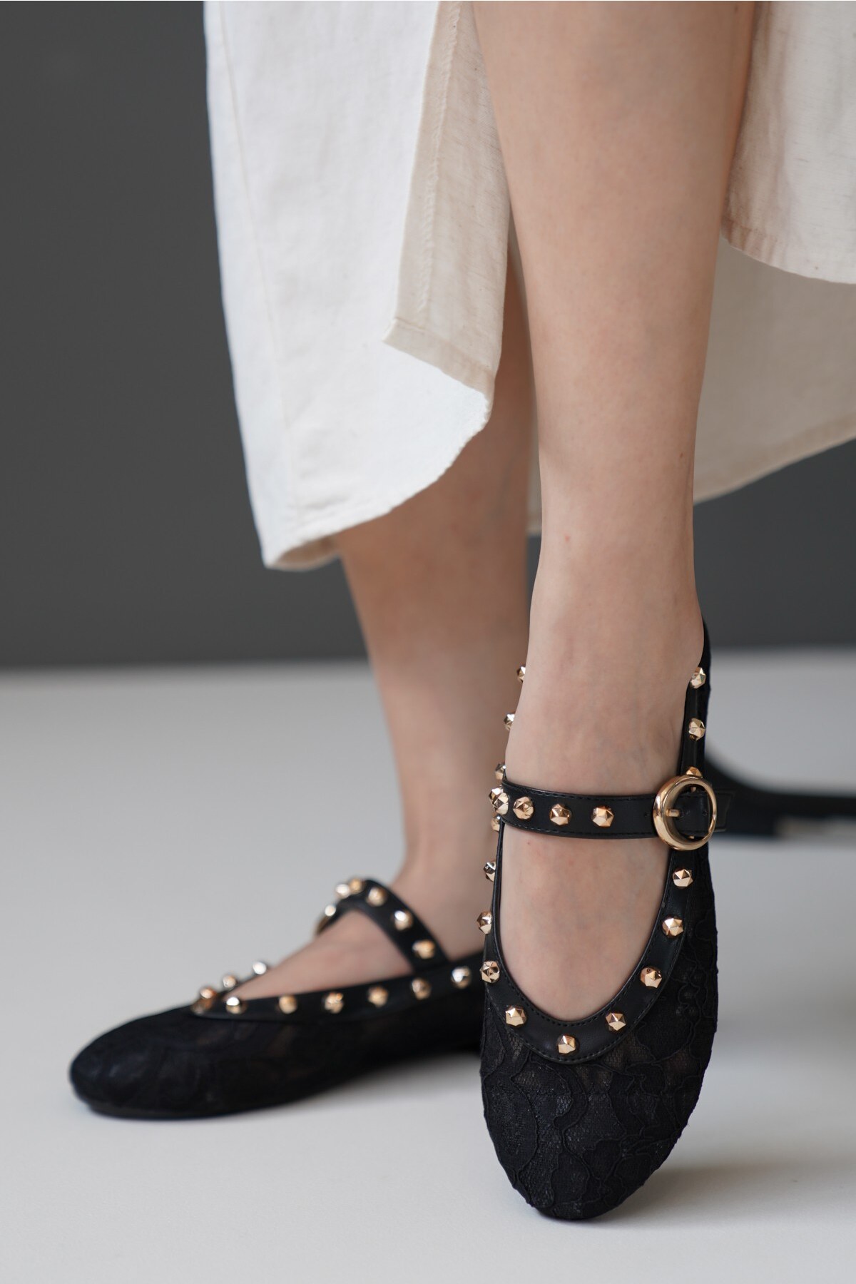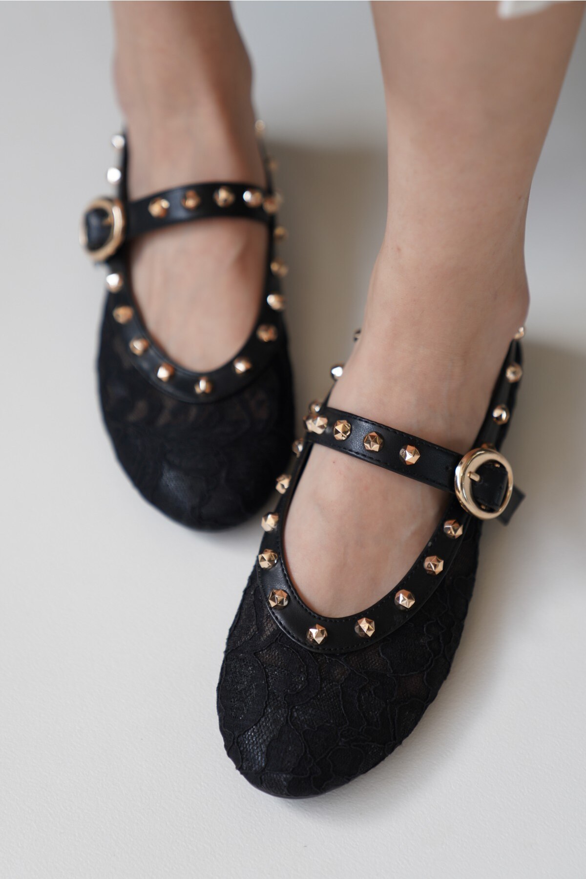 Kadın Dantel Gold Çivili Babet Cloi Siyah