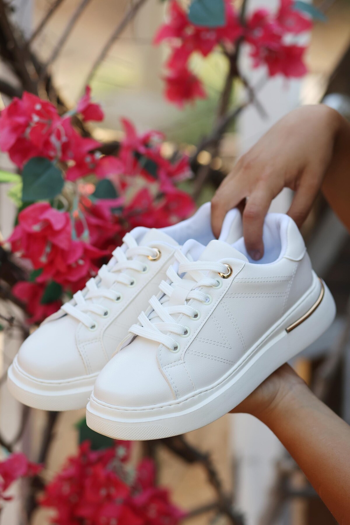 Kadın Gold Detay Bağcıklı Günlük Ayakkabı Sporra Beyaz