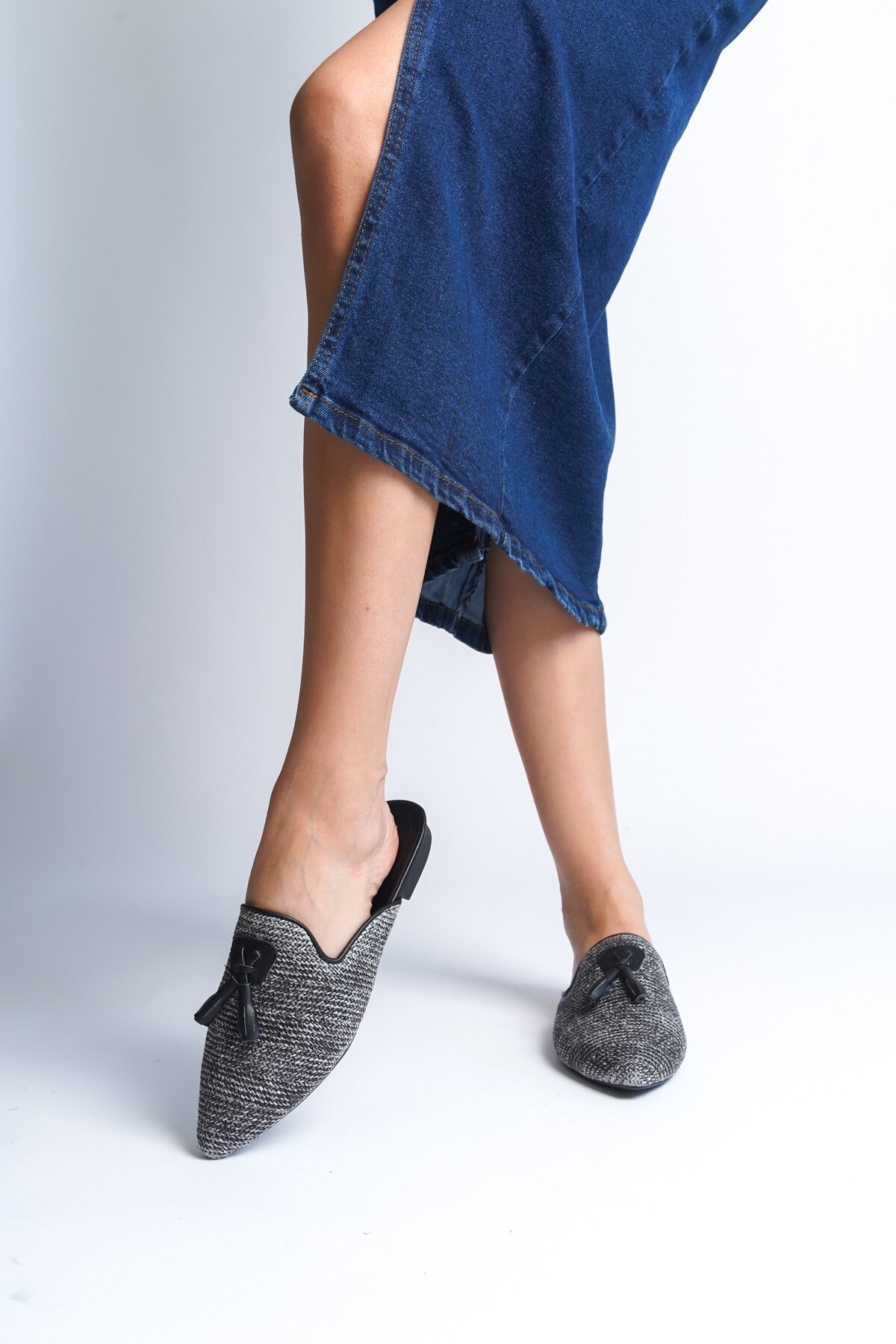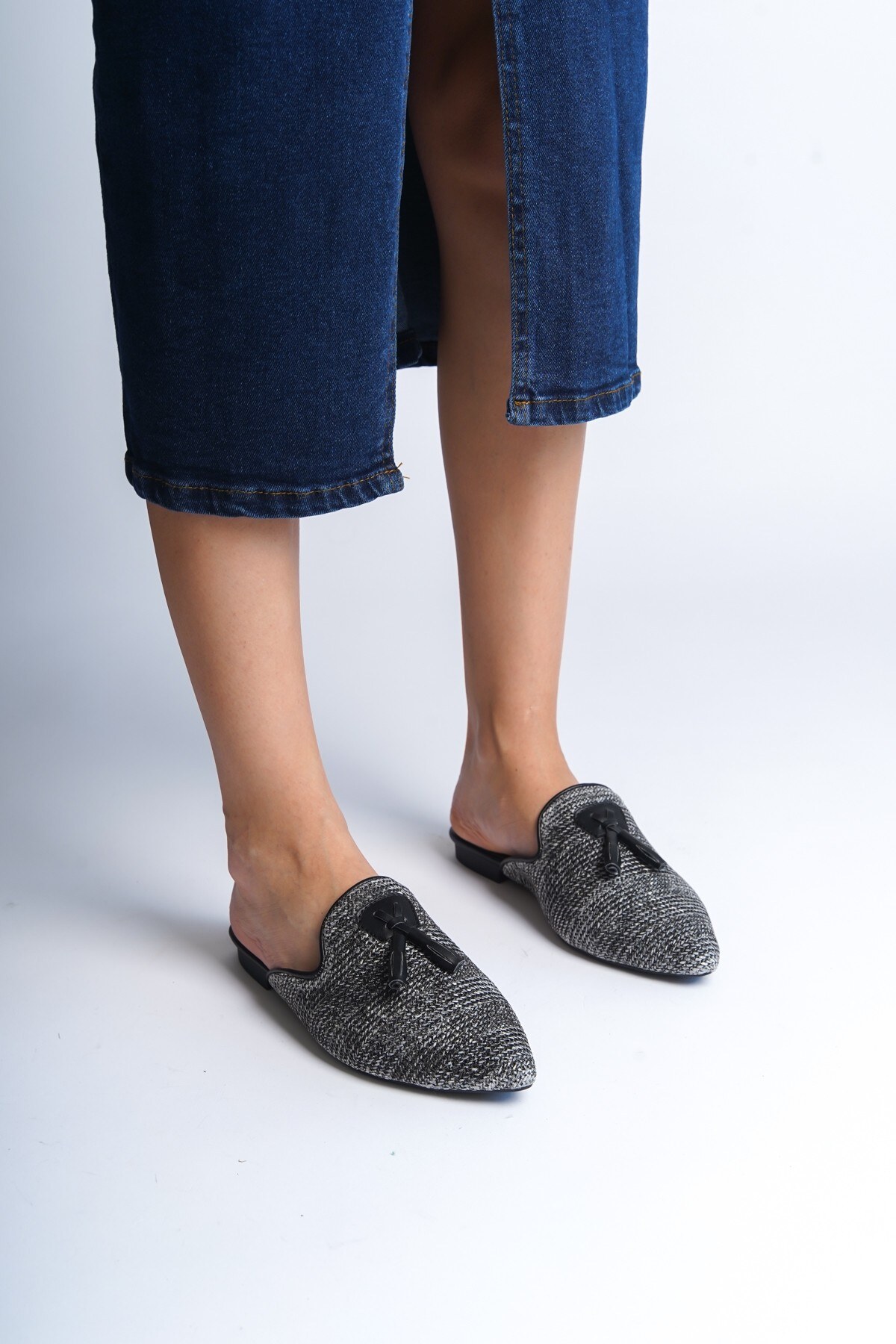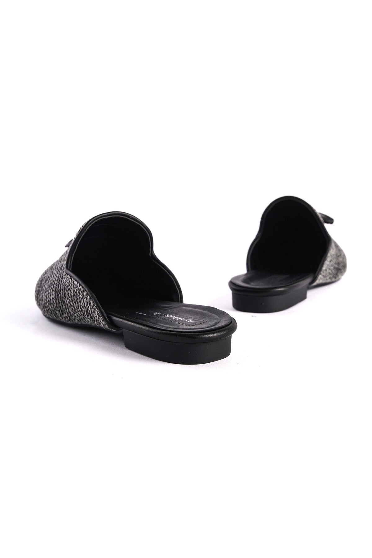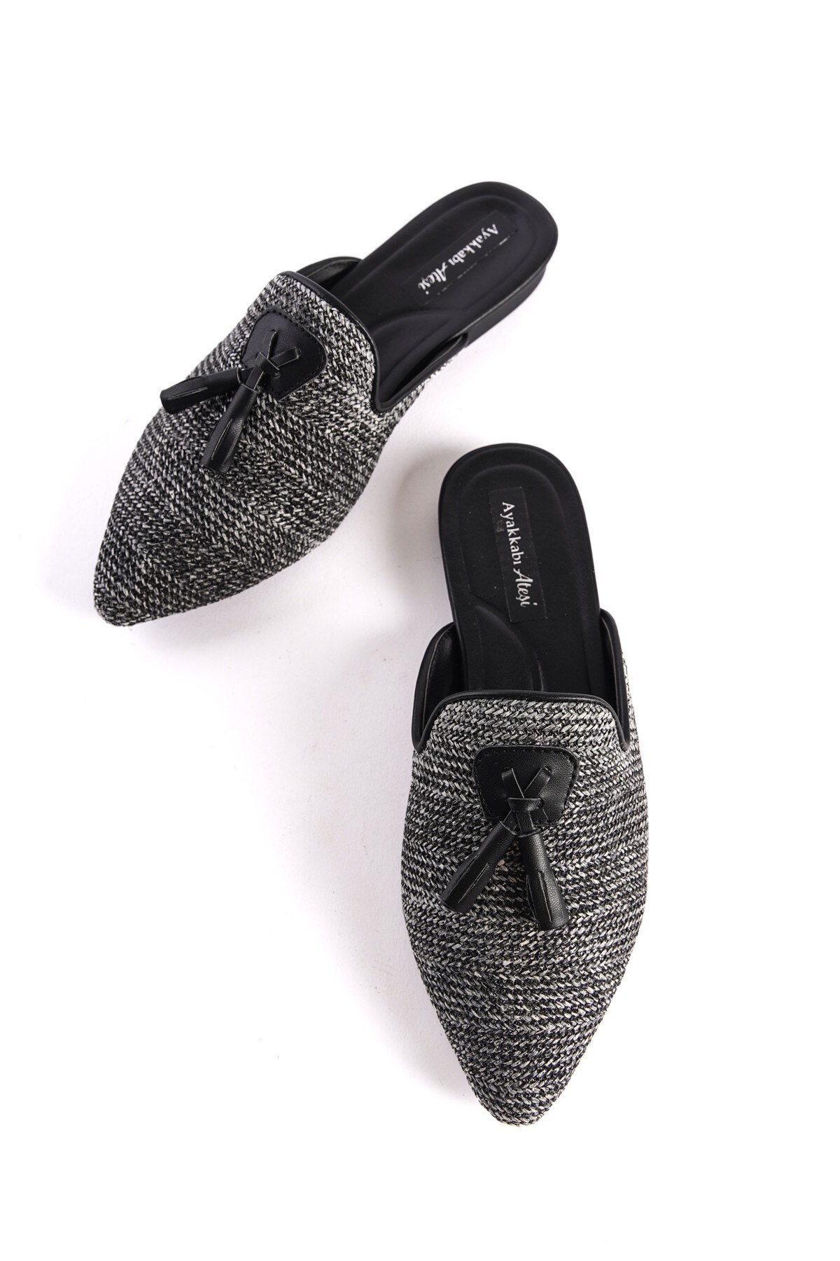 Kadın Bej Hasır Sivri Burunlu Terlik Tona Siyah