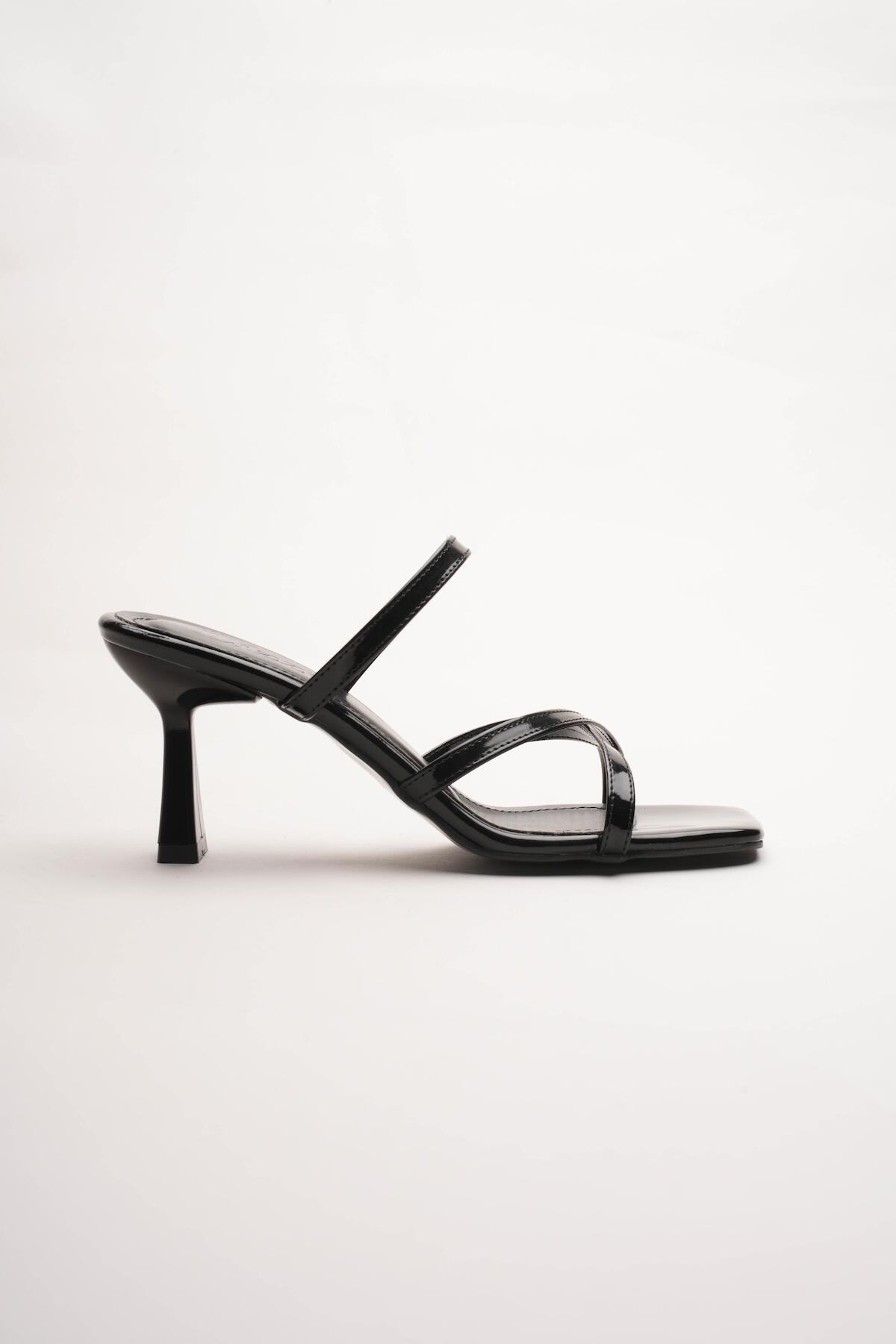 Kadın Çapraz Bantlı Tasarım Topuklu Terlik Carele Siyah Rugan