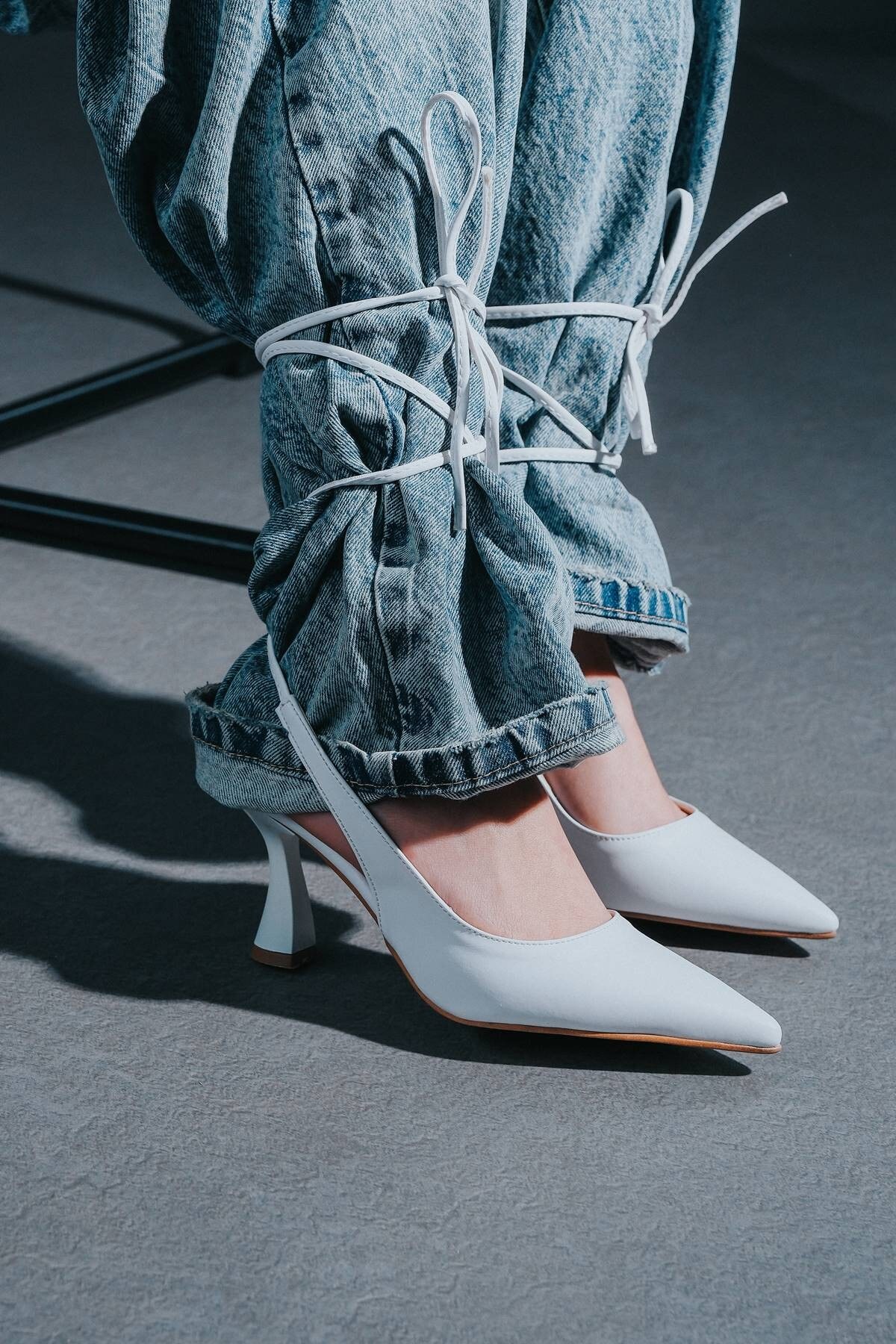 Beyaz Cilt Bilekten Bağlamalı Kadın Topuklu Ayakkabı Sise Beyaz Cilt
