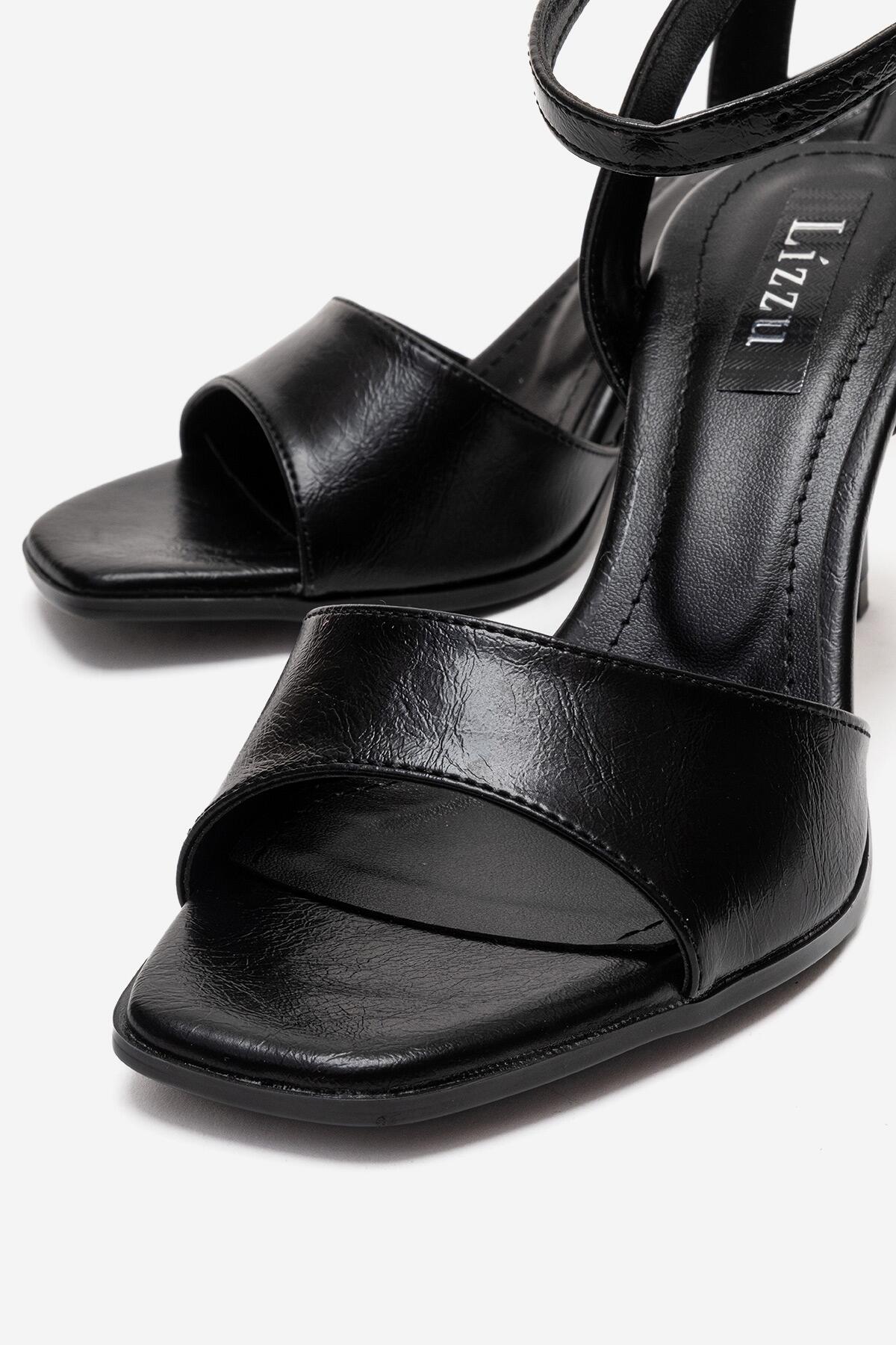 Kadın Burun Açık Bilekten Baretli Topuklu Ayakkabı Paris Siyah Kırışık