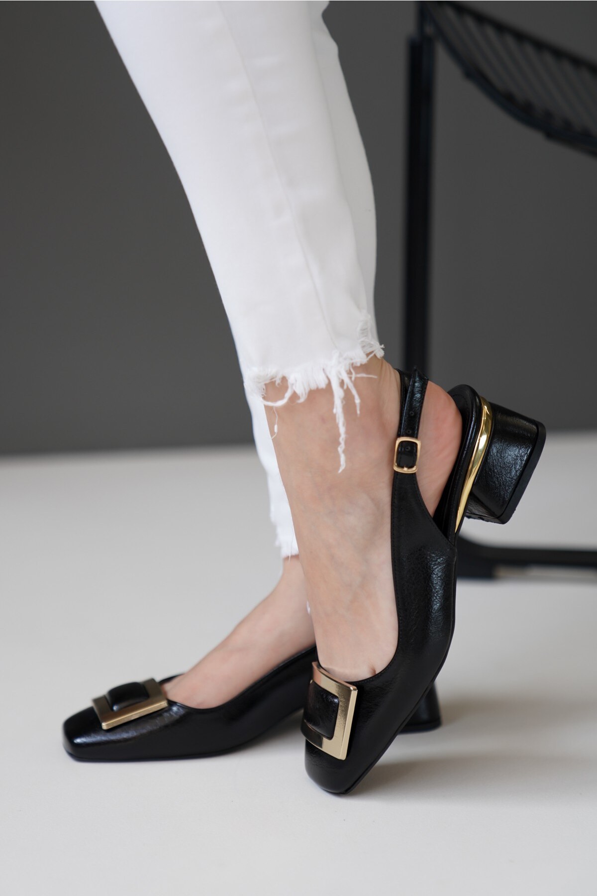 Kadın Gold Kare Toka Kısa Topuklu Ayakkabı Siyon Siyah