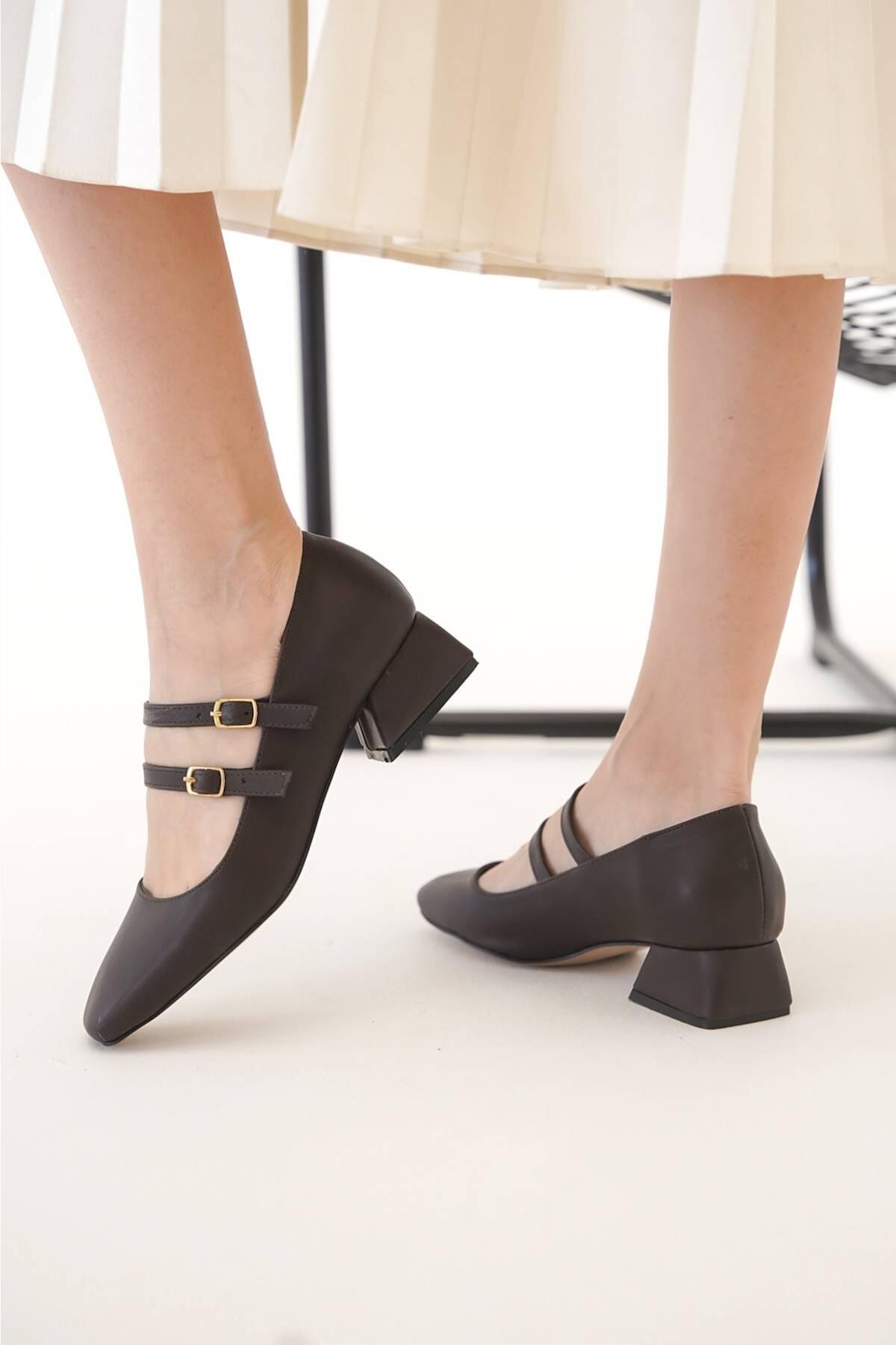 Kadın İki Baret Kısa Topuklu Ayakkabı Alara Kahverengi