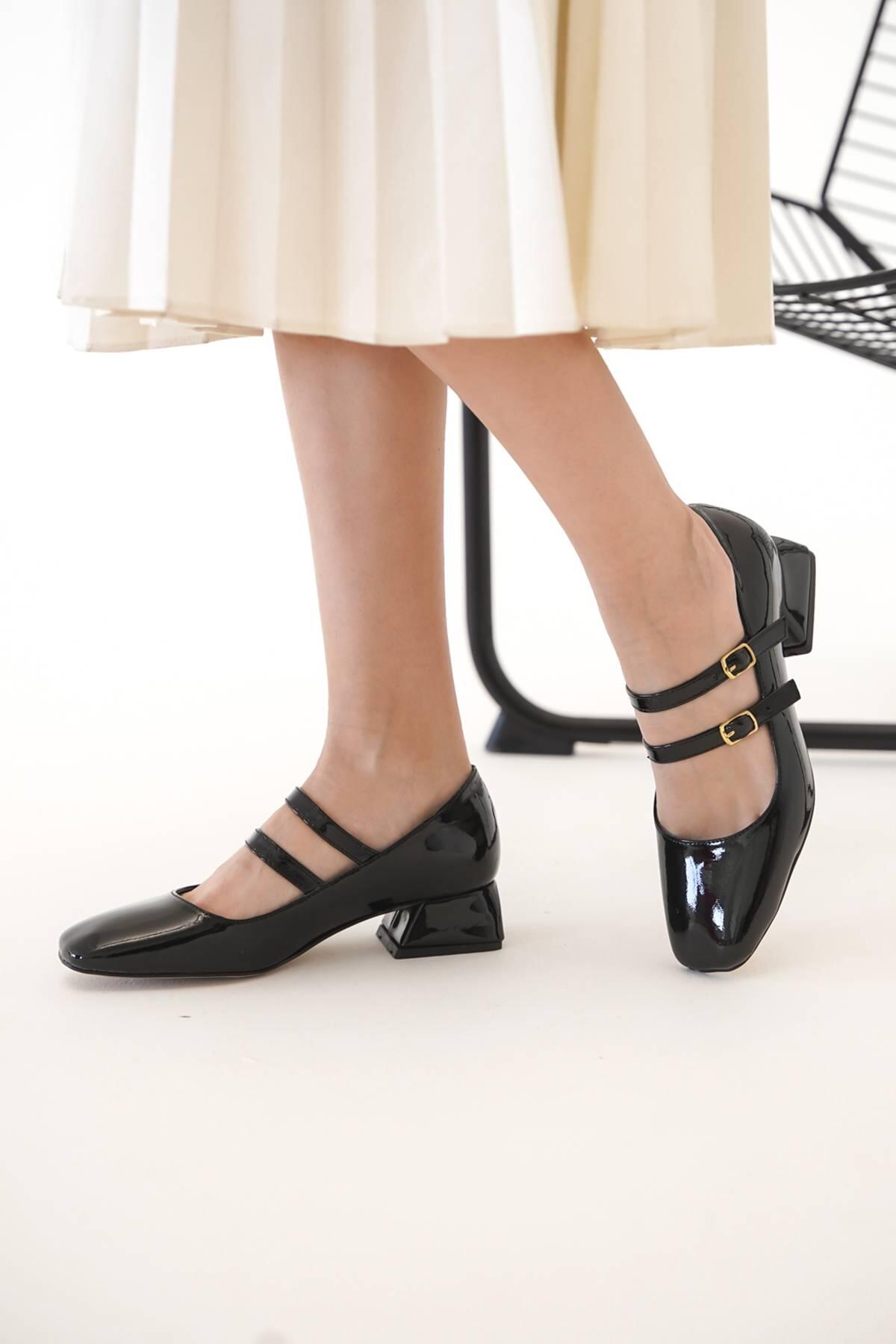 Kadın İki Baret Kısa Topuklu Ayakkabı Alara Siyah Rugan