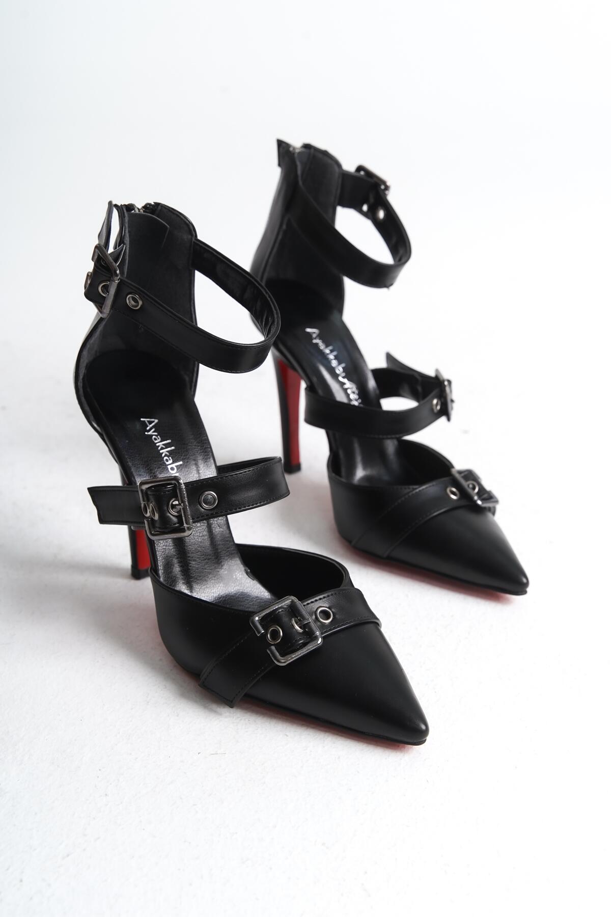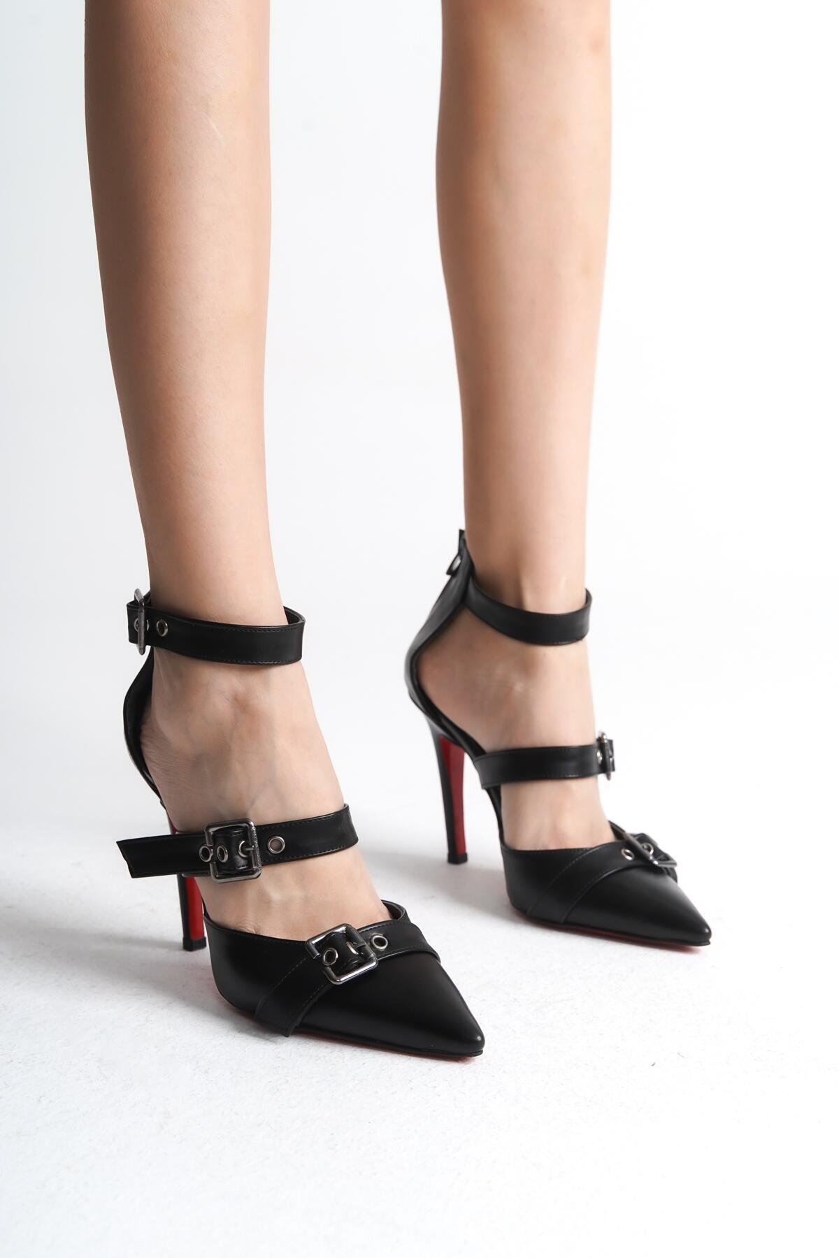 Kadın İnce Topuklu Tokalı Ayakkabı Stiletto Sansa Siyah Cilt