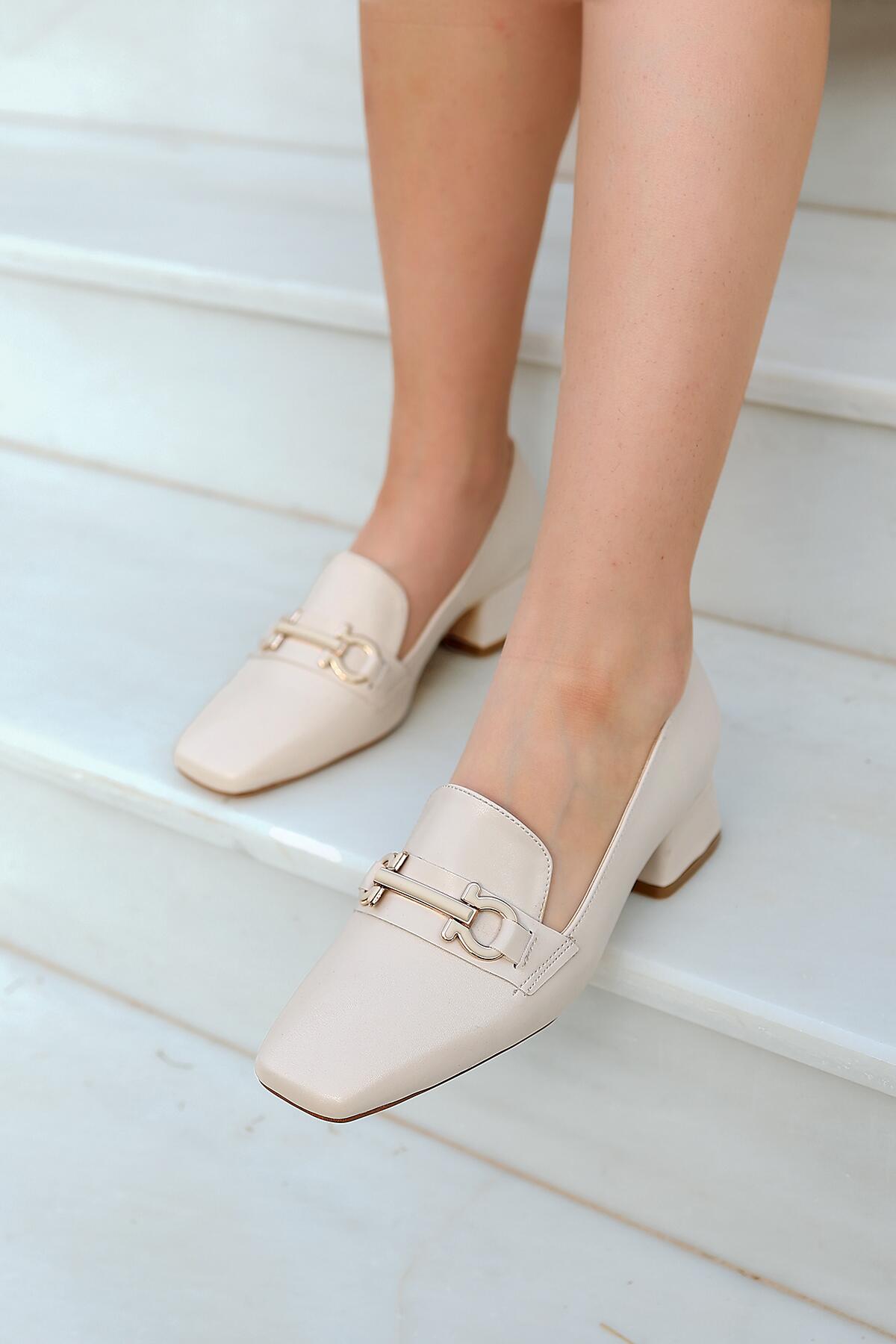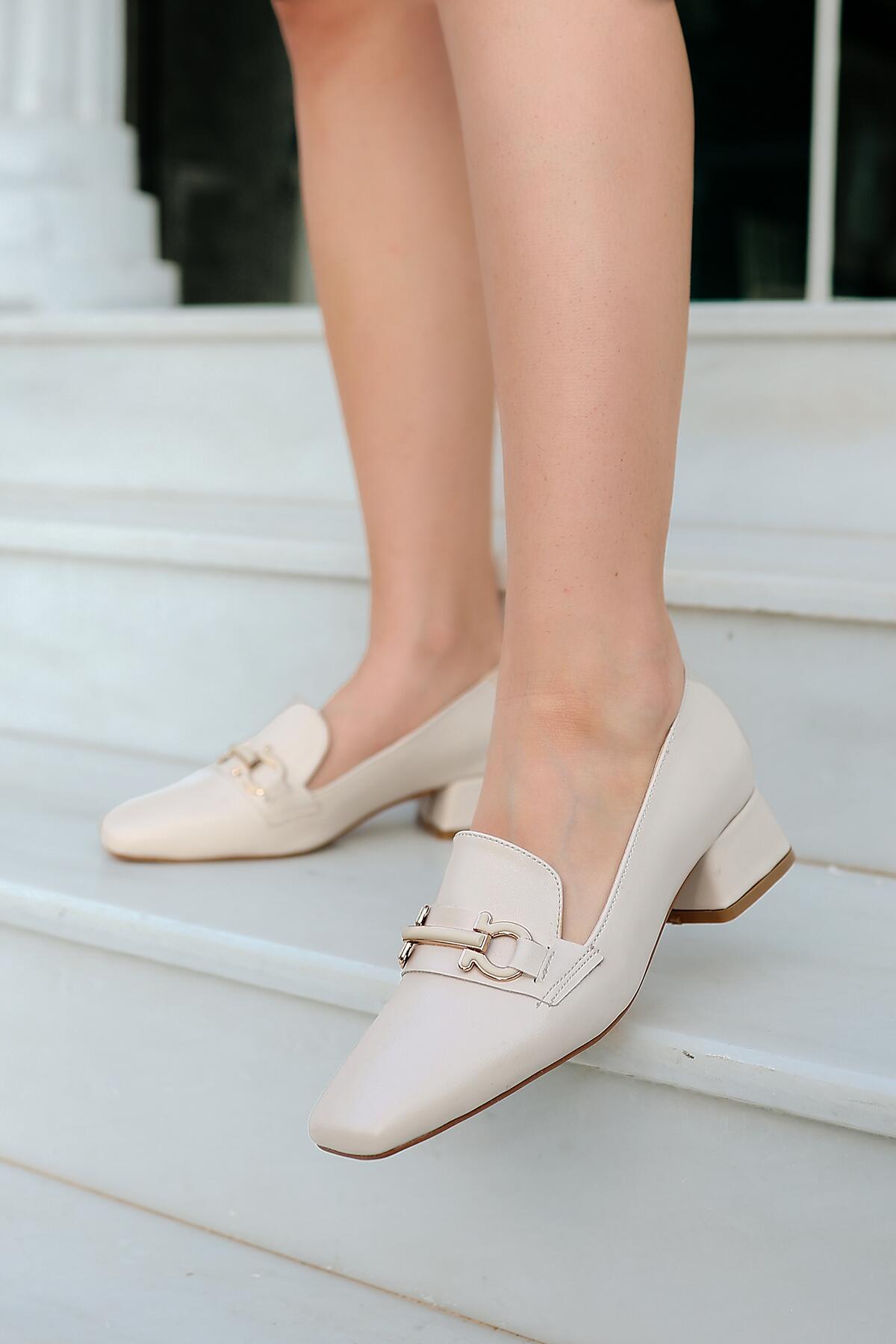 Kadın Kısa Topuklu Burnu Kapalı Topuklu Ayakkabı Dier Bej