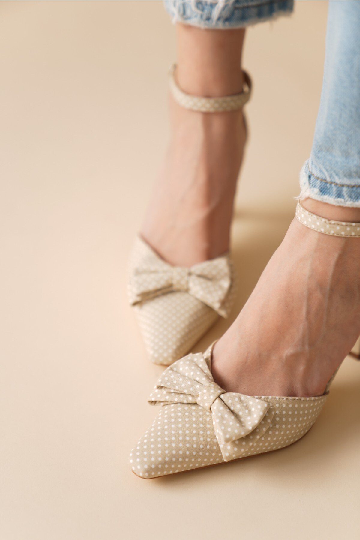 Kadın Puantiyeli Papyon Detay Topuklu Ayakkabı Pitirella Bej