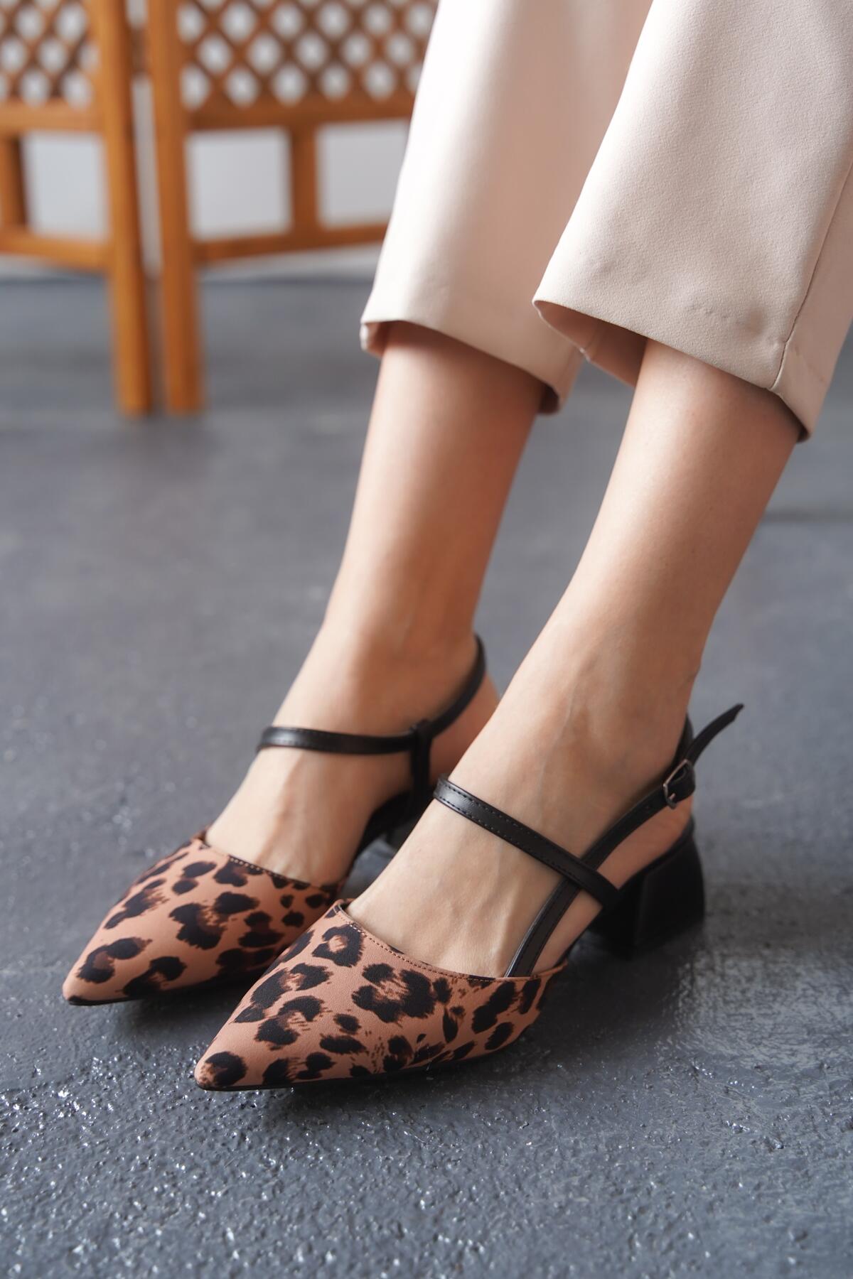 Kadın Tasarım Baret Arka Açık Kısa Topuklu Ayakkabı Emoi Siyah - Taba Leopar