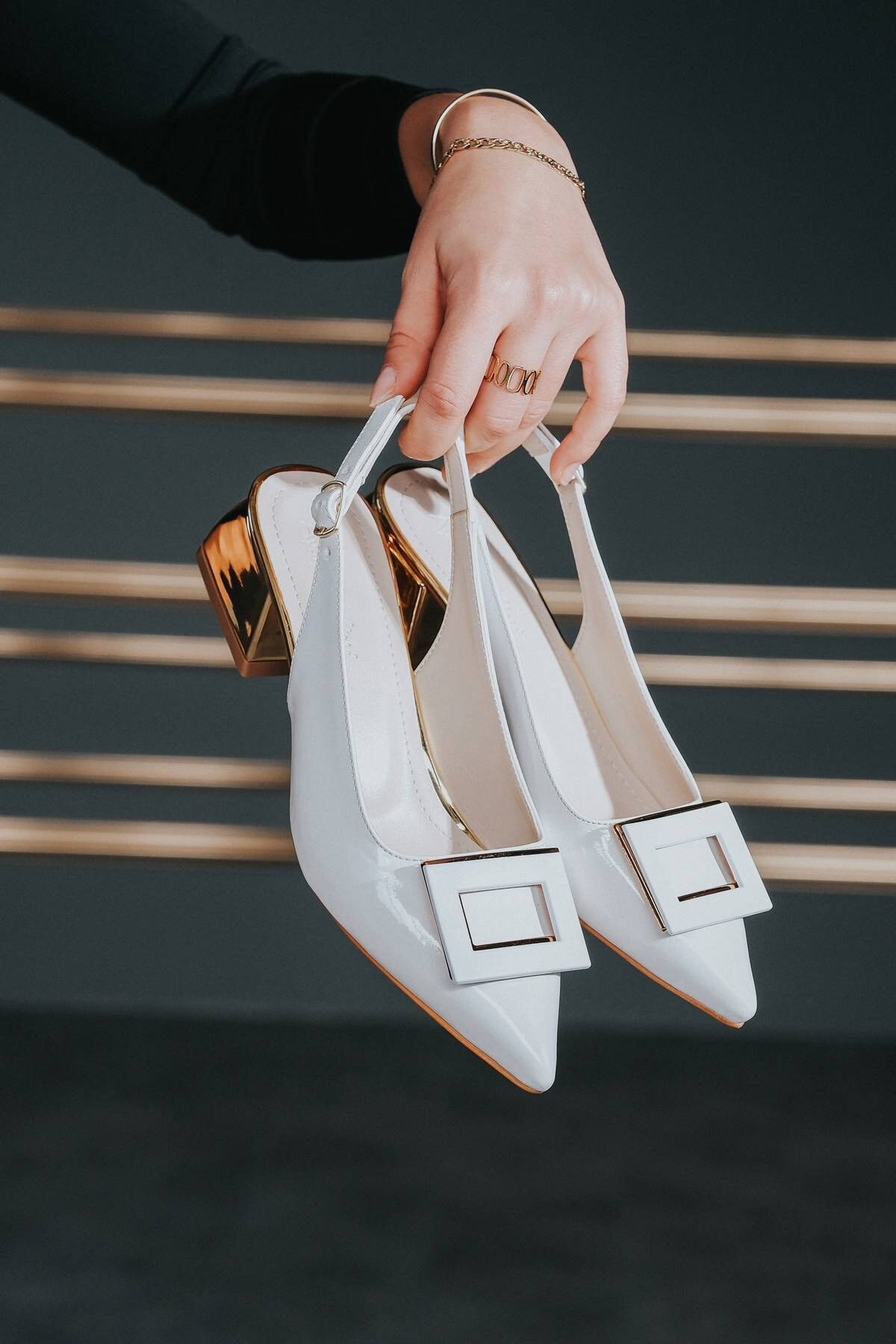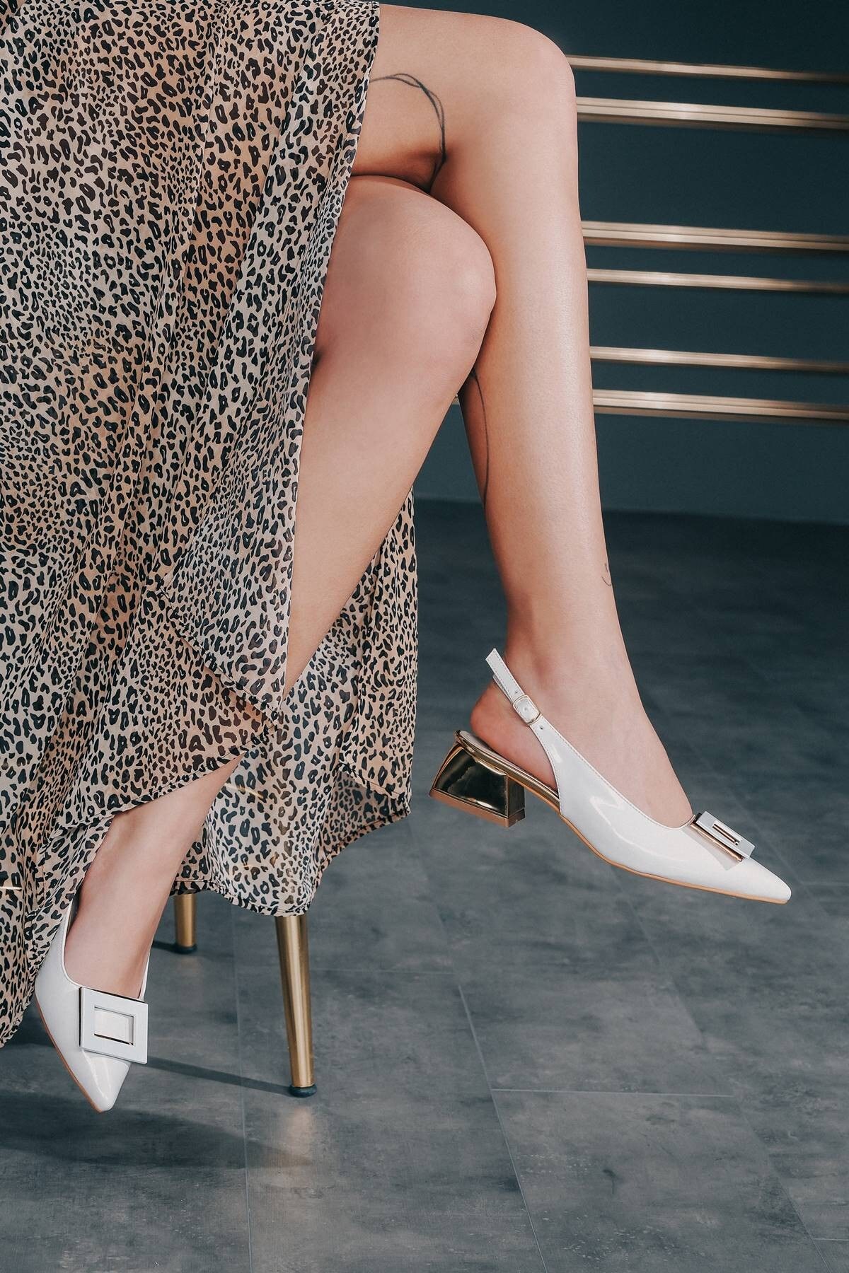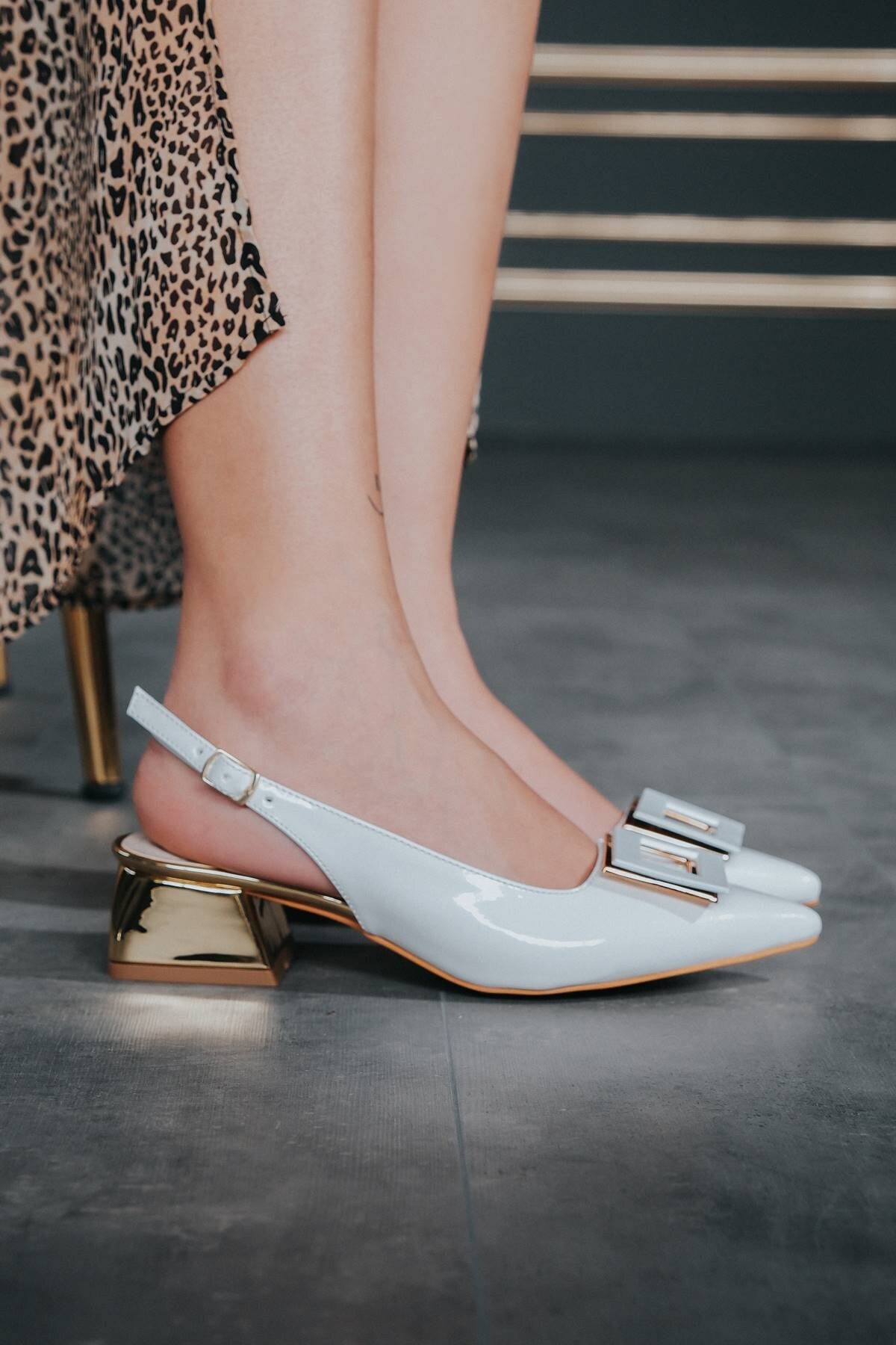 Beyaz Rugan Tasarım Tokalı Kadın Topuklu Ayakkabı Niola
