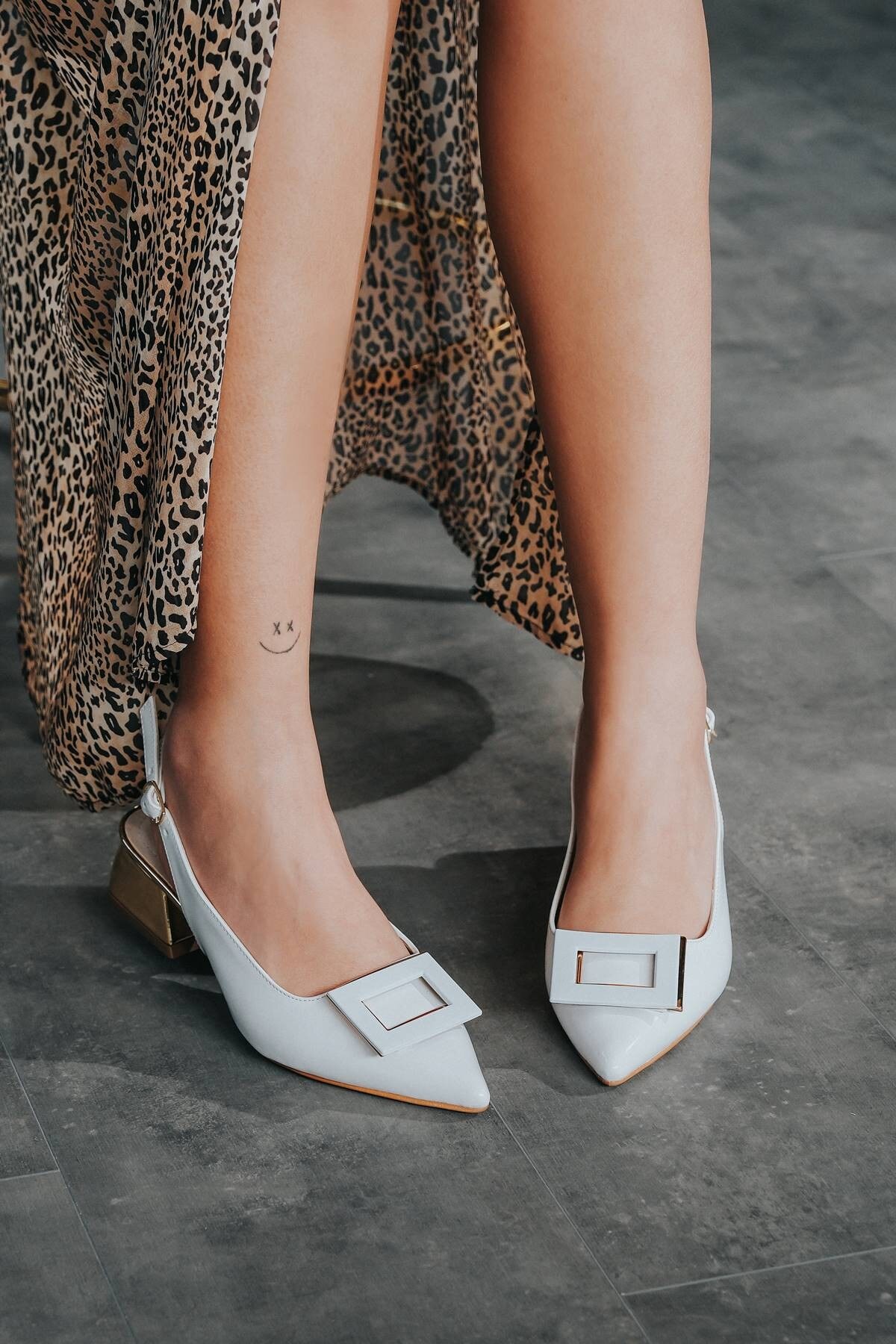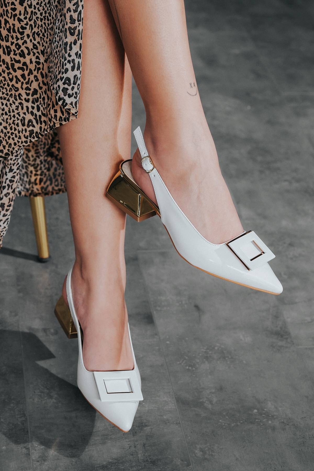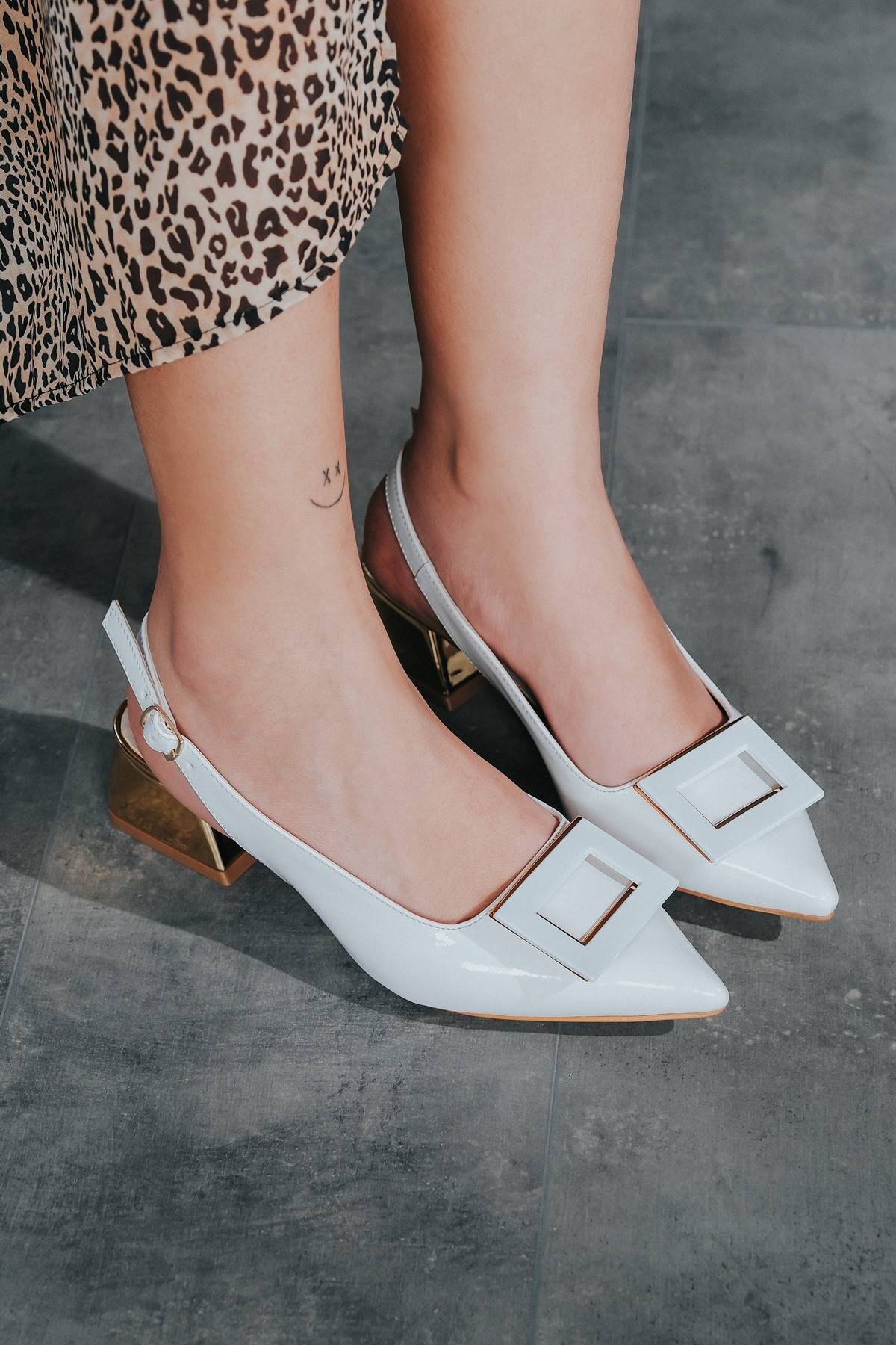 Kadın Tasarım Toka Kısa Topuklu Ayakkabı Beyaz Rugan