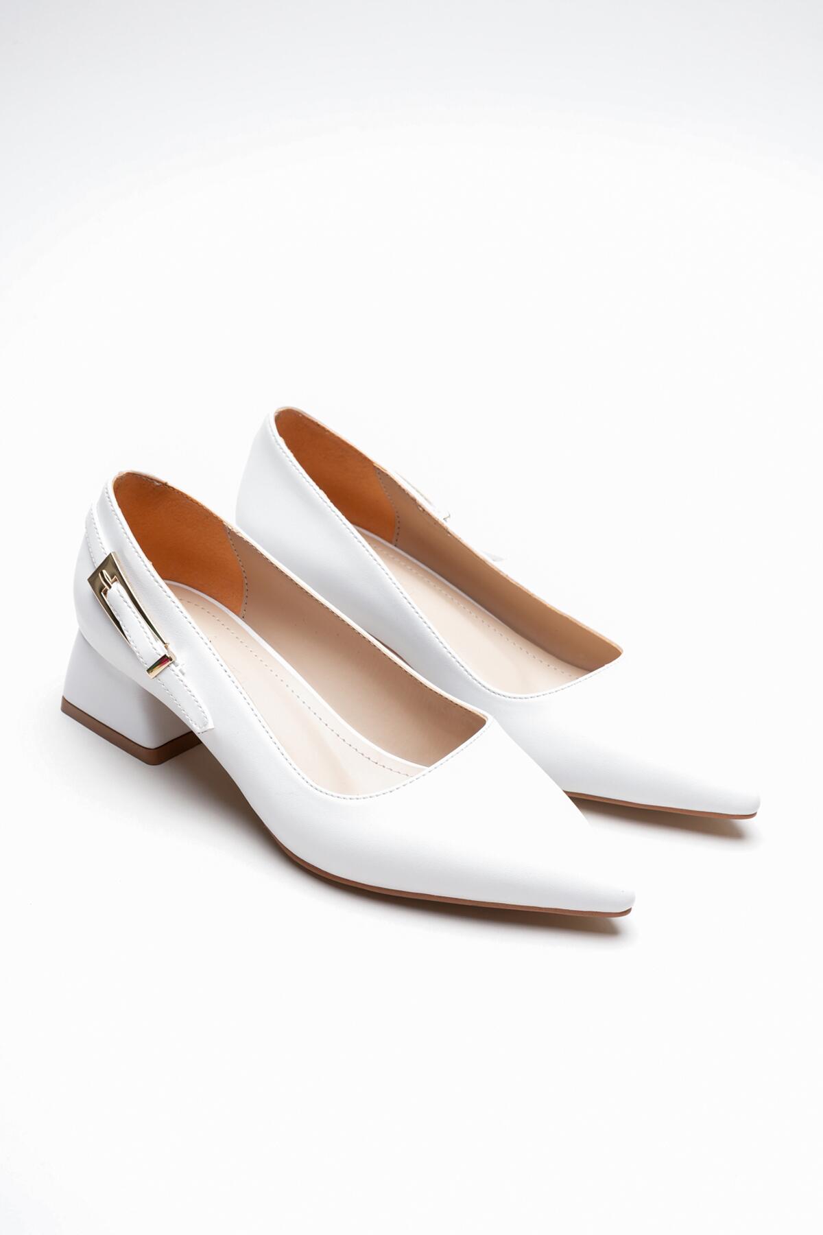 Kadın Yandan Toka Detaylı Kalın Kısa Topuklu Ayakkabı Goria Beyaz Cilt