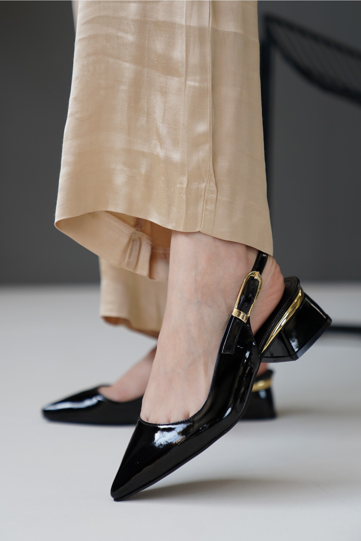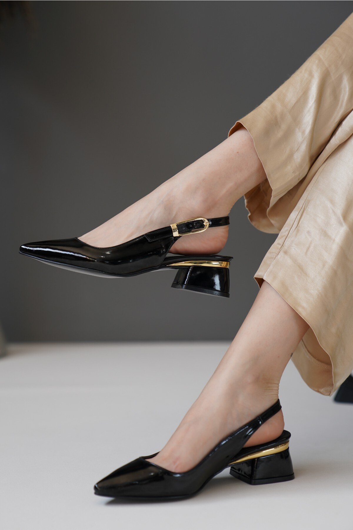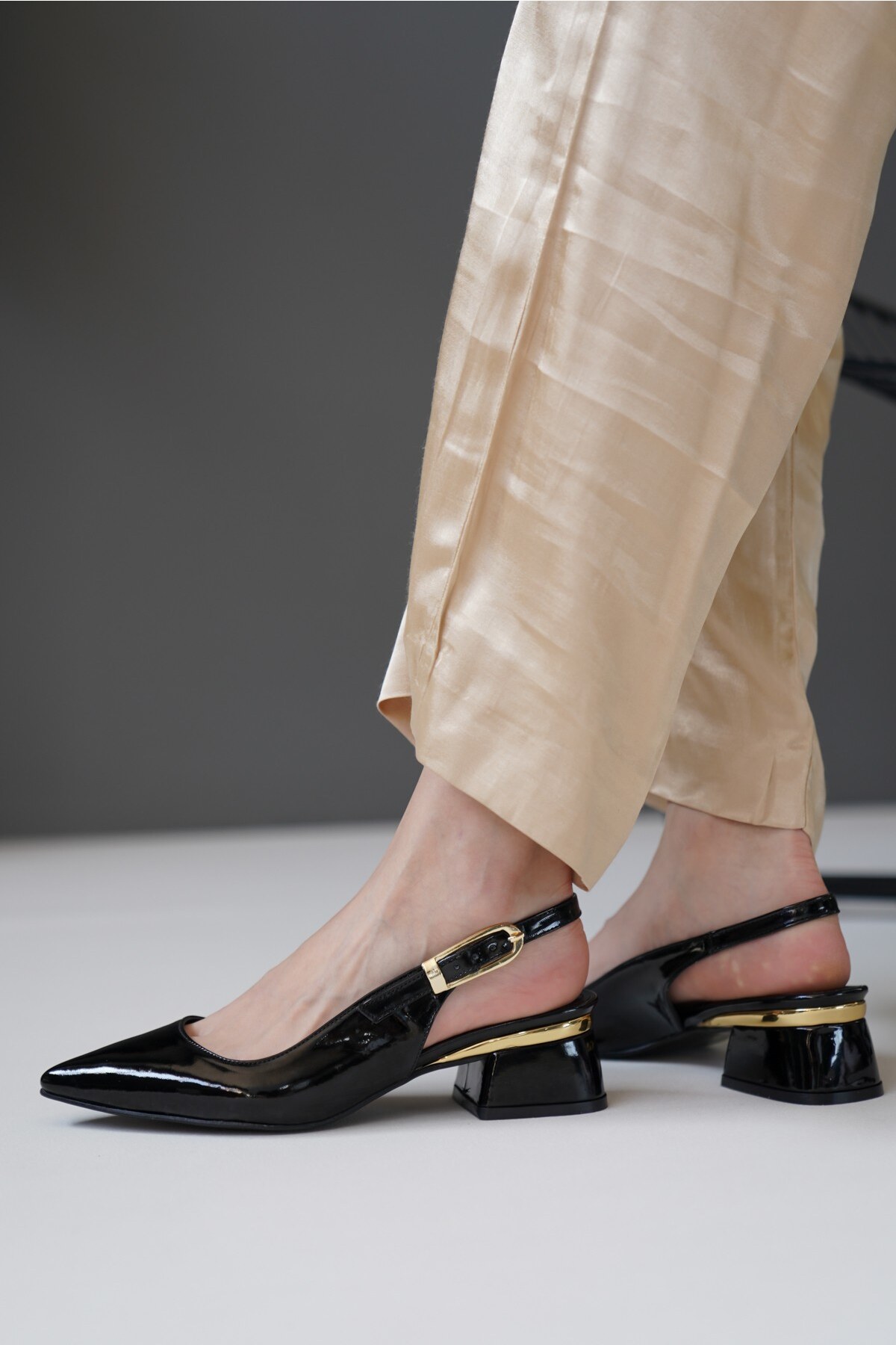 Kadın Gold Kare Toka Kısa Topuklu Ayakkabı Siyon
