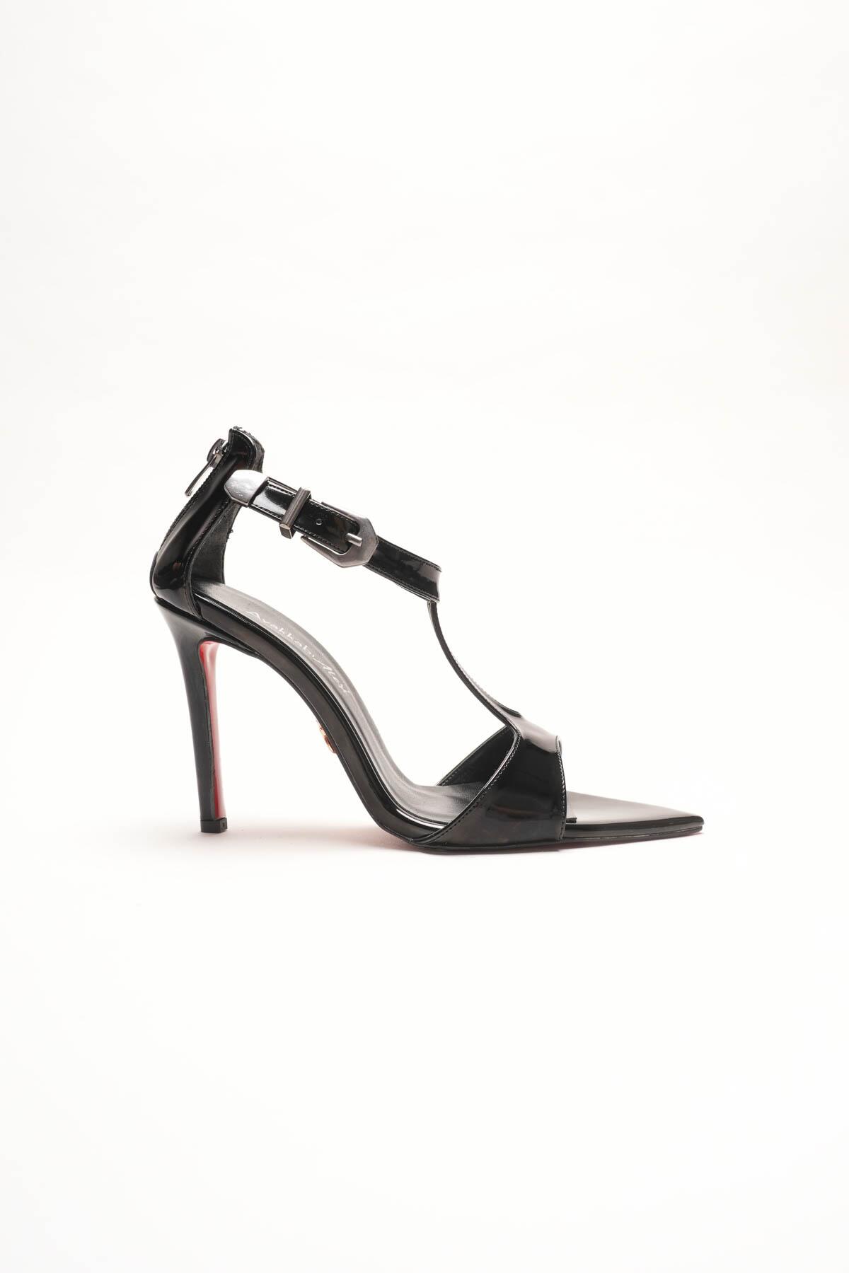 T-bantlı Toka Detaylı Sivri Burun İnce Topuklu Stiletto Ayakkabı Tories Siyah Rugan