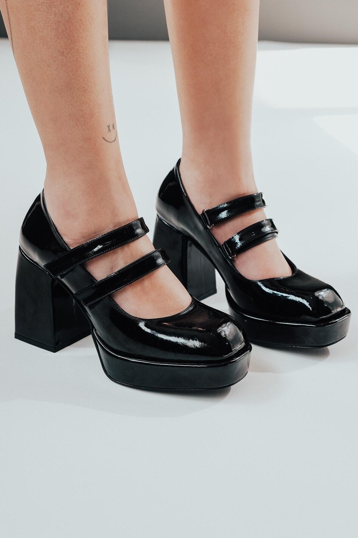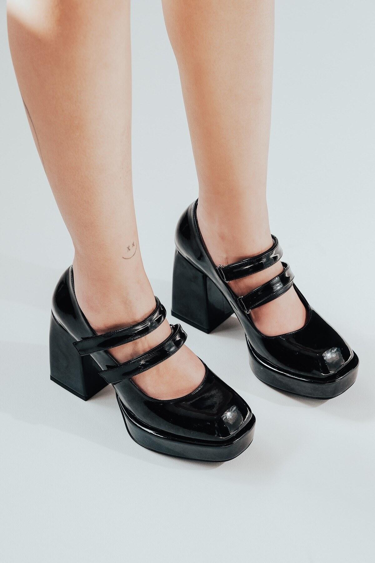 Beyaz Rugan Çift Cırtlı Kadın Platform Topuklu Ayakkabı Girona Siyah Rugan