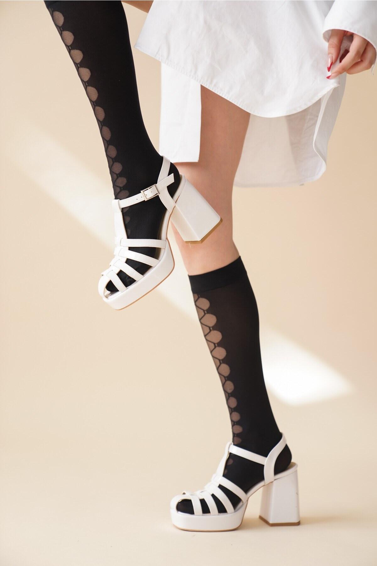 Kadın Gladyatör Kalın Topuklu Ayakkabı Hira Beyaz Rugan