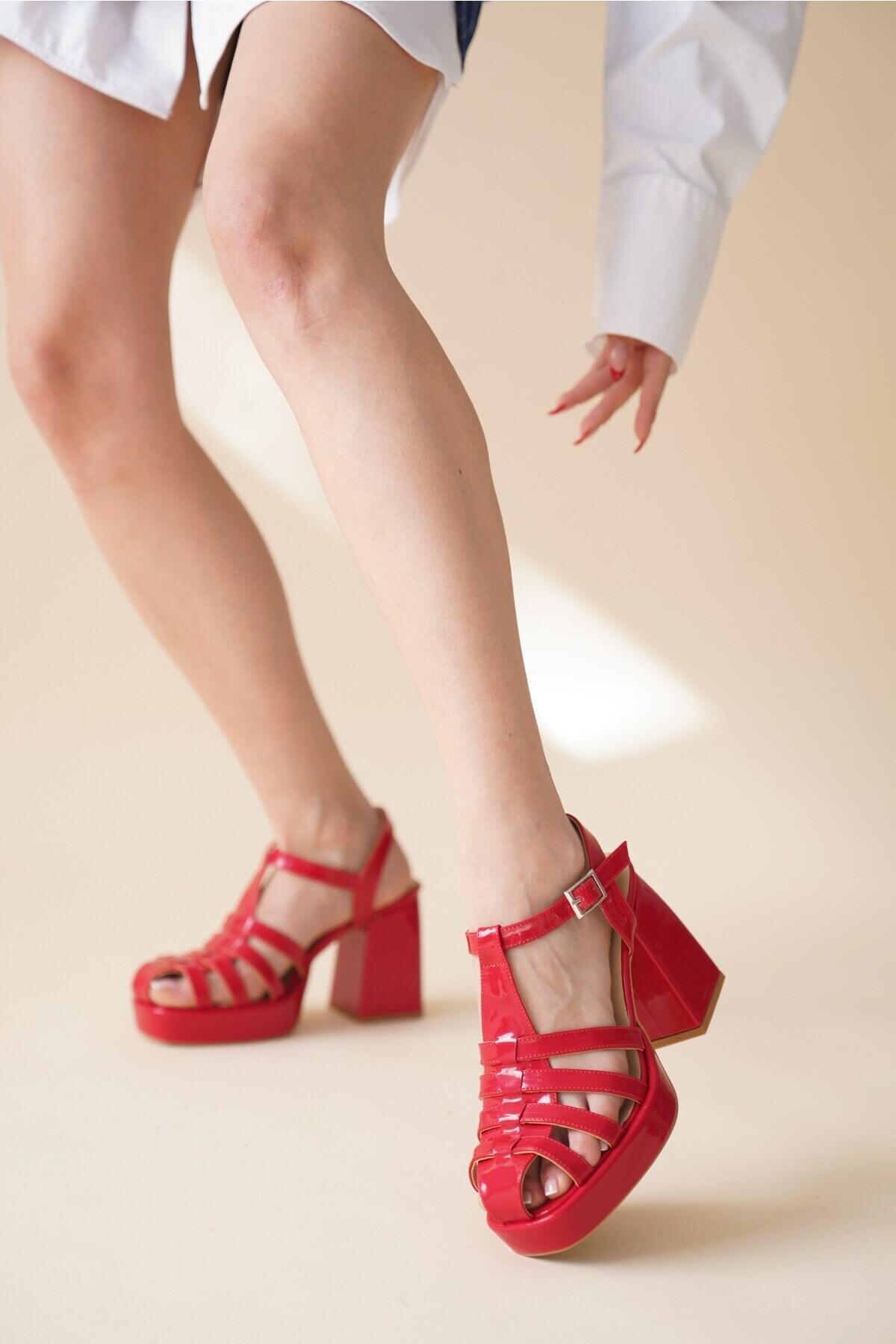 Kadın Gladyatör Kalın Topuklu Ayakkabı Hira Kırmızı Rugan