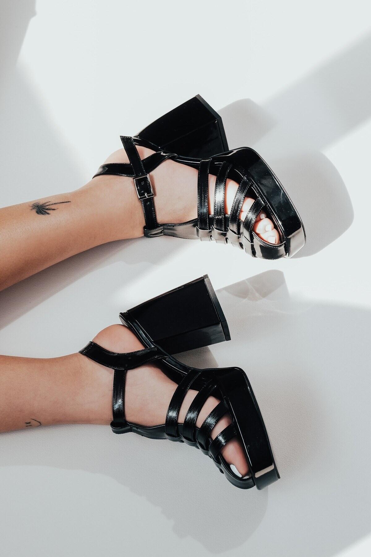 Kadın Gladyatör Kalın Topuklu Ayakkabı Hira Siyah Rugan