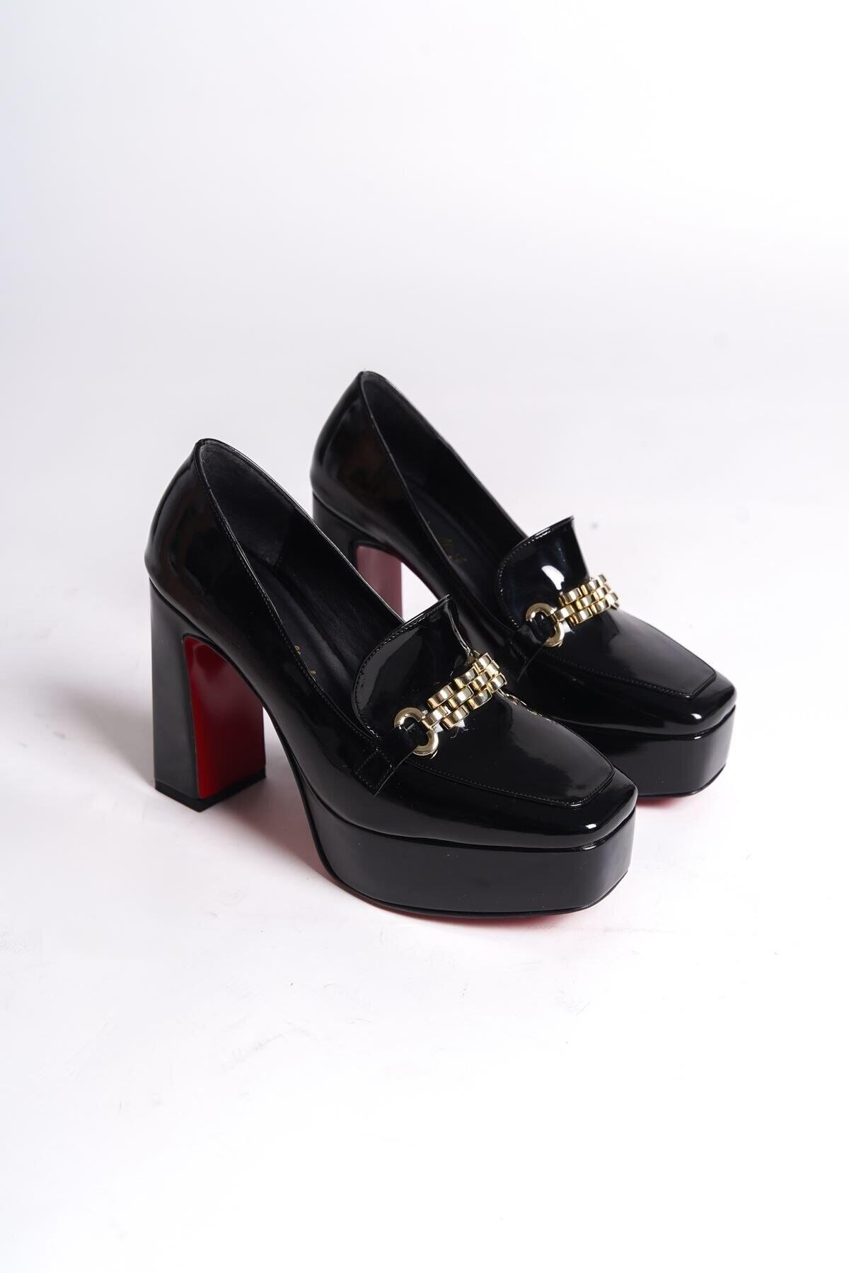 Kadın Platform Tasarım Toka Detaylı Orta Topuklu Ayakkabı Vanera Siyah Rugan