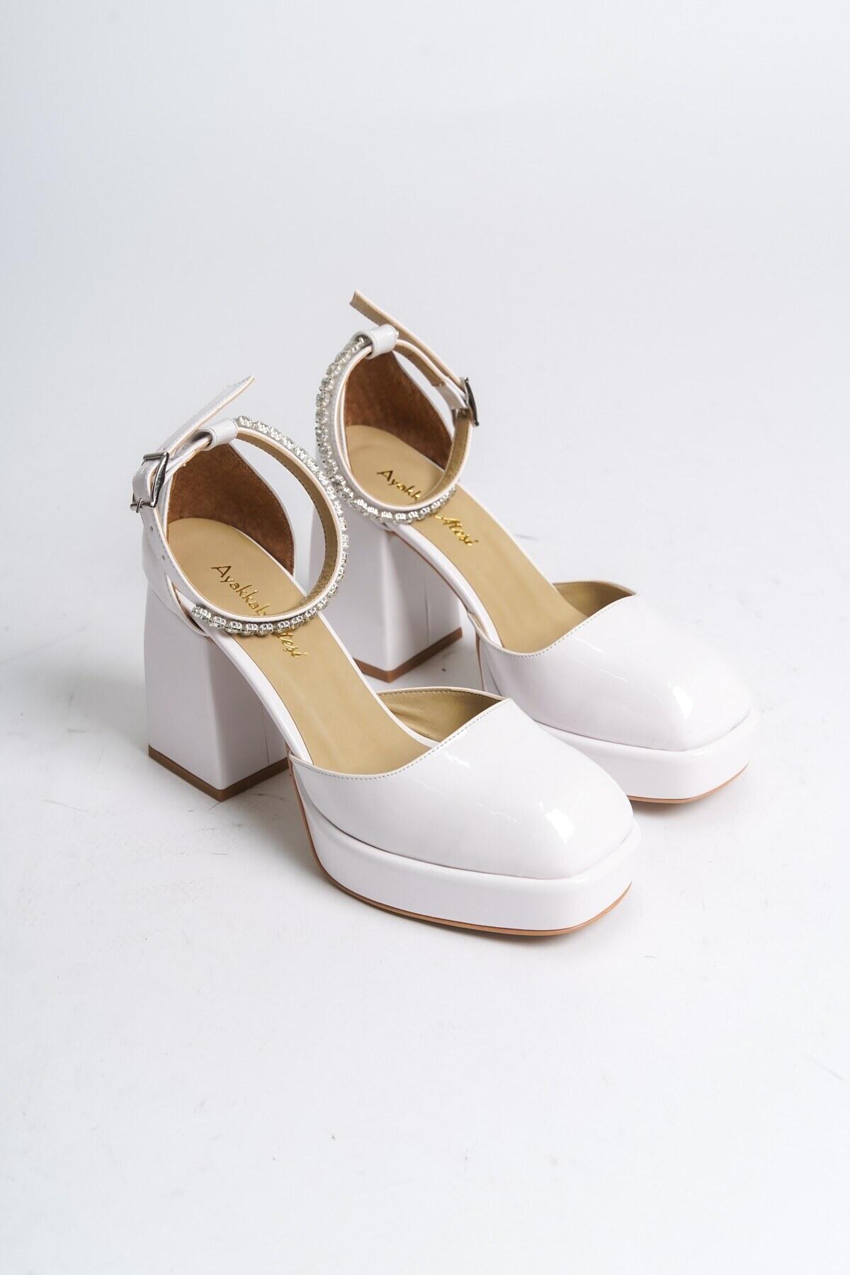 Kadın Taş Detaylı Özel Tasarım Alçak Topuklu Ayakkabısı Sandy Beyaz Rugan