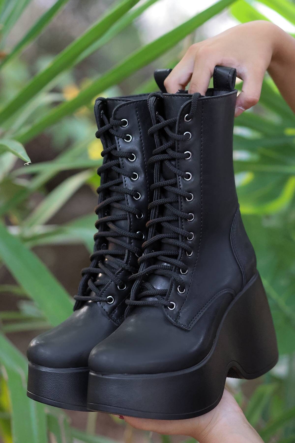 Kadın Dolgu Topuk Bağcıklı Bot Zina Siyah Siyah