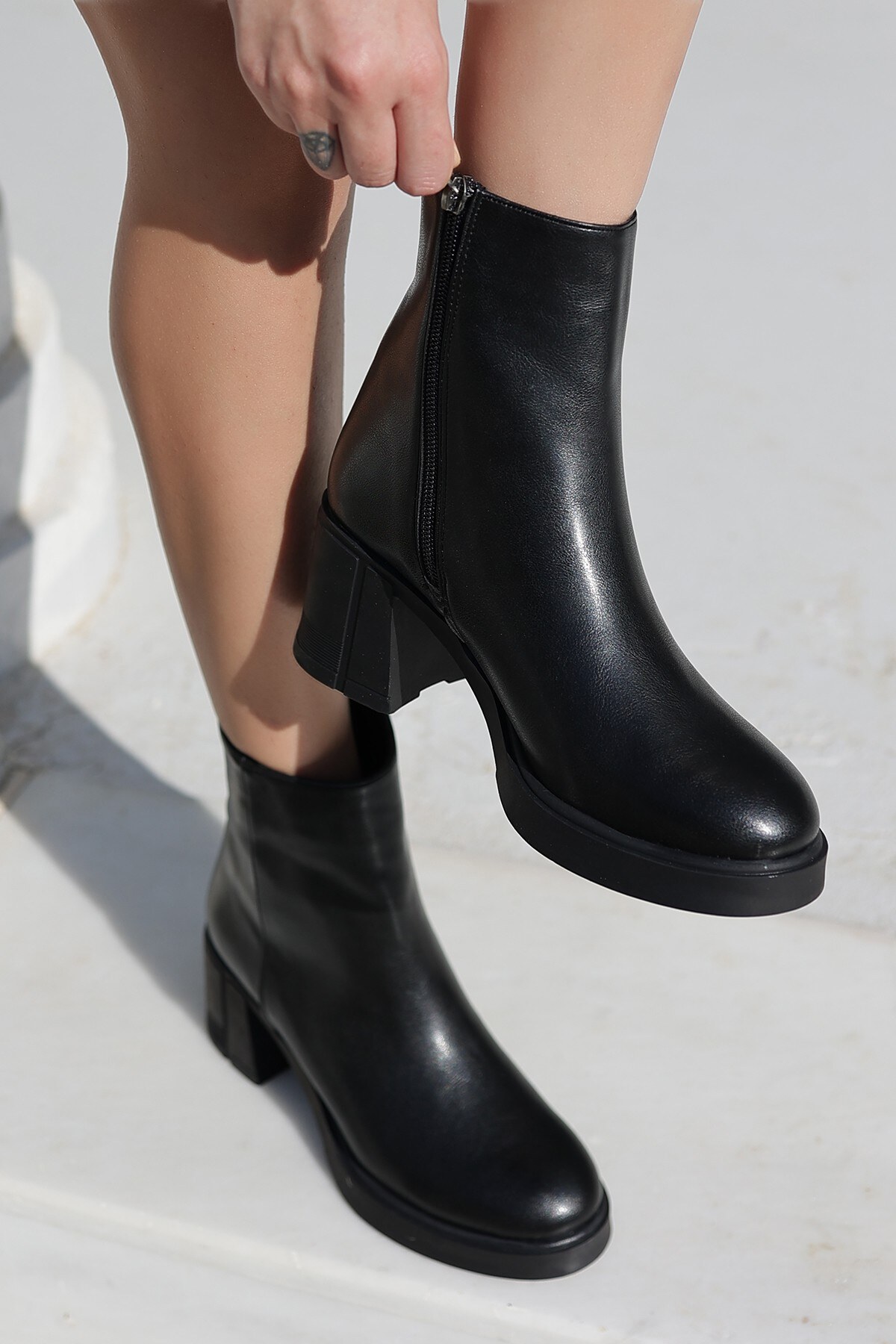 Orta boy topuklu olup, sağlam bir platform tabana sahiptir. Botların yan tarafında fermuar detayı bulunur, bu da giyip çıkarmayı kolaylaştırır. Bilek hizasında biten bu botlar şık ve modern bir tasarıma sahiptir.