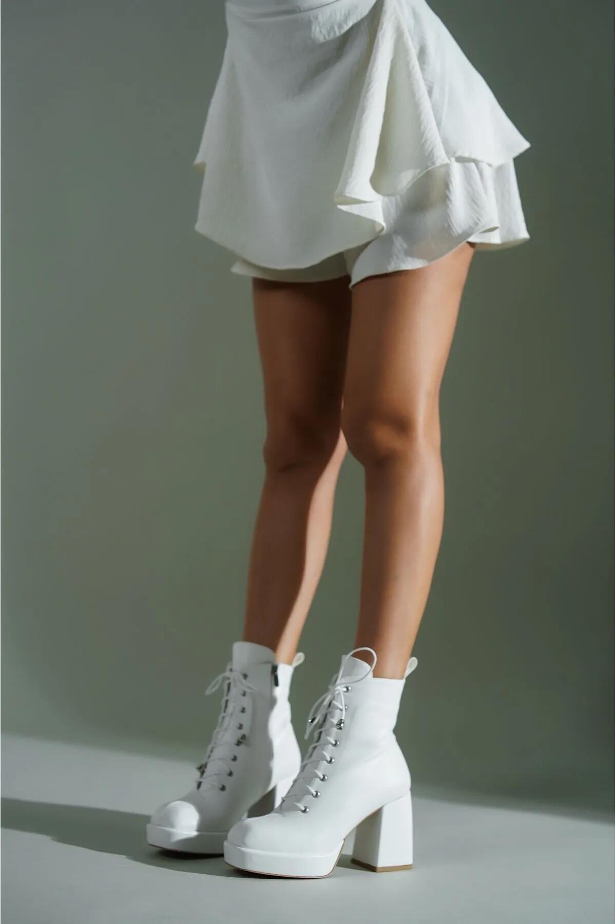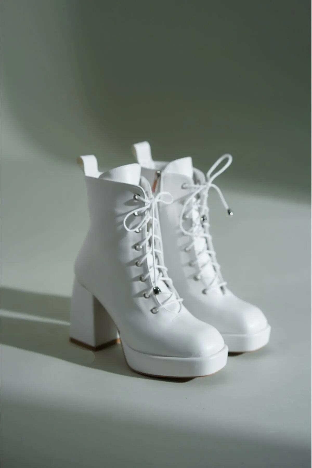 Kadın Platform Topuklu Bağcıklı Bot Ribel Beyaz Cilt