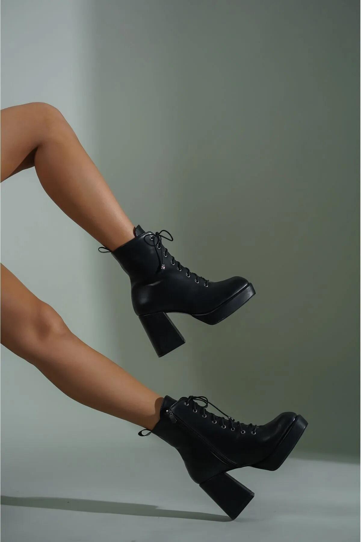 Kadın Platform Topuklu Bağcıklı Bot Ribel Siyah Cilt