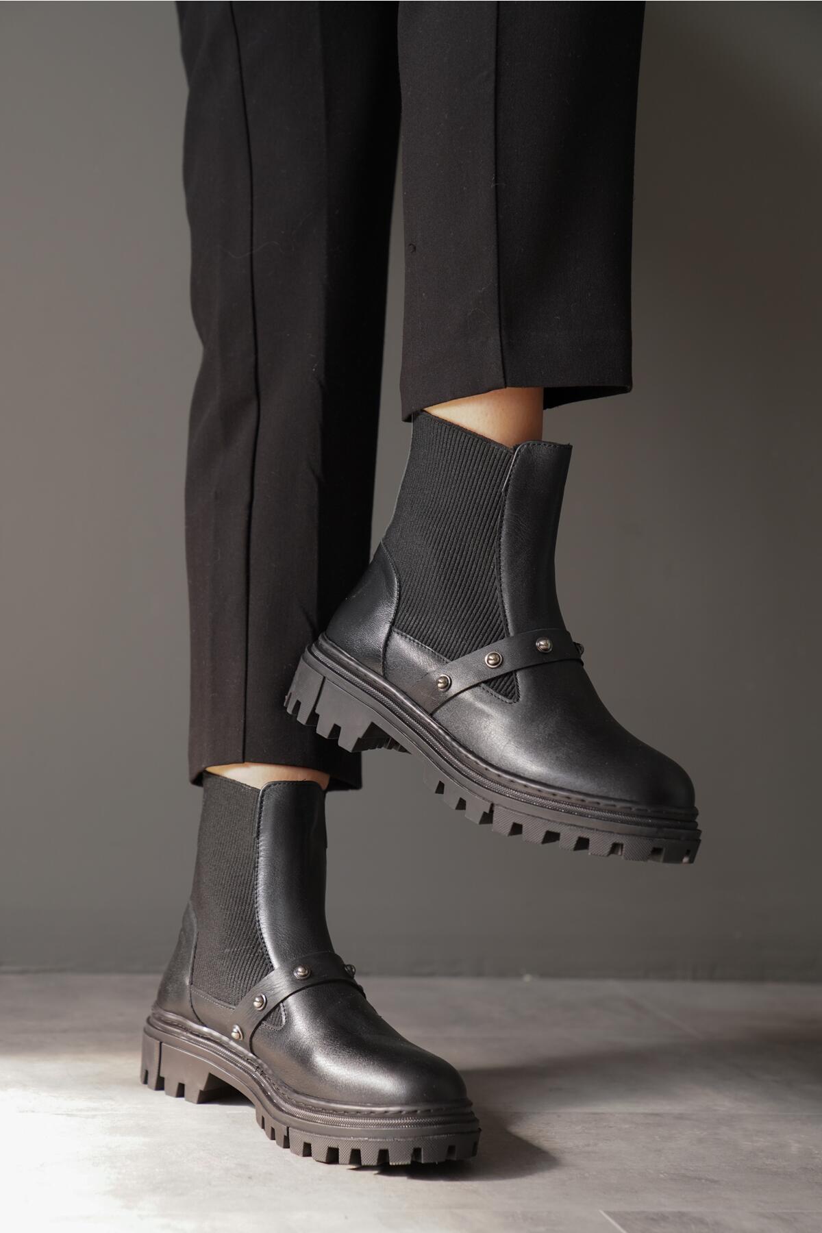 Kadın Zımba Detay Lastikli Hakiki Deri Düz Bot Trokie Siyah