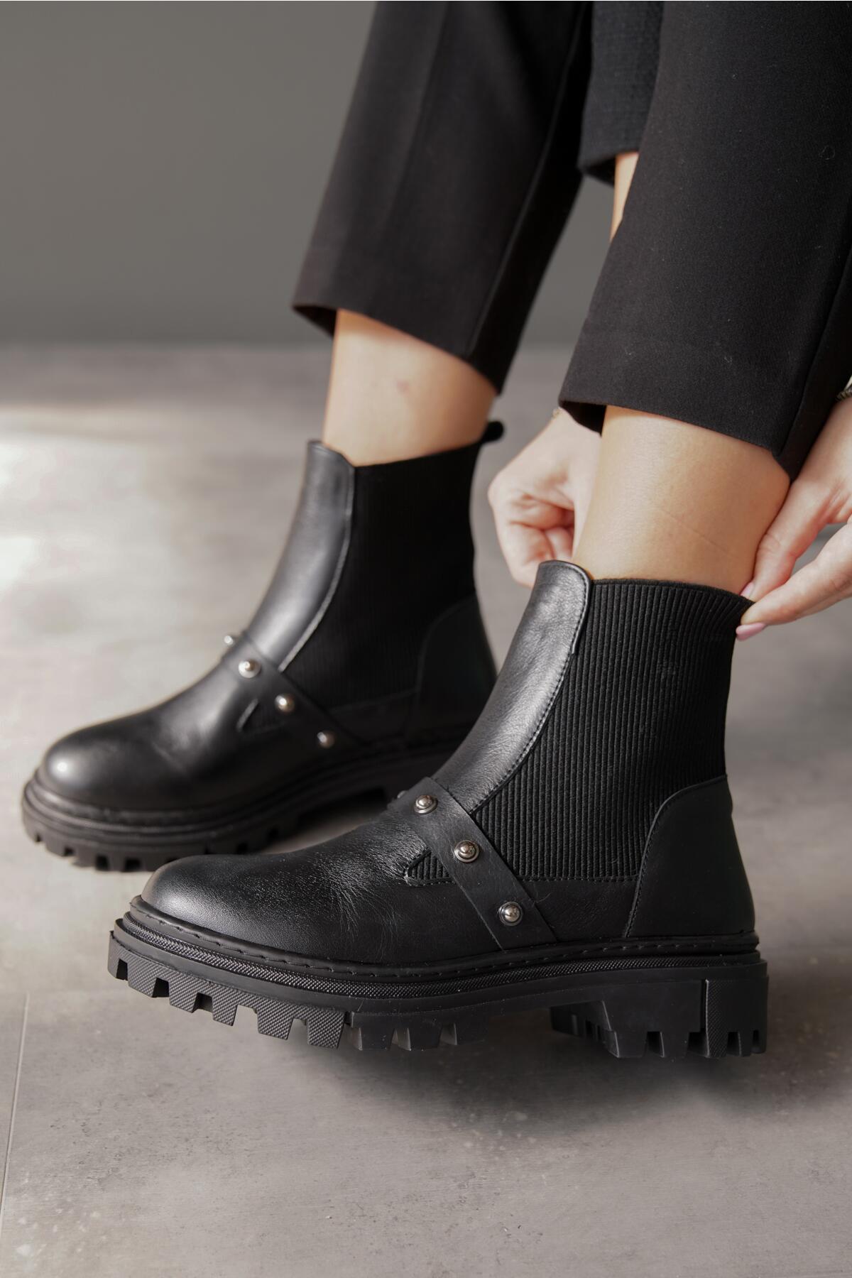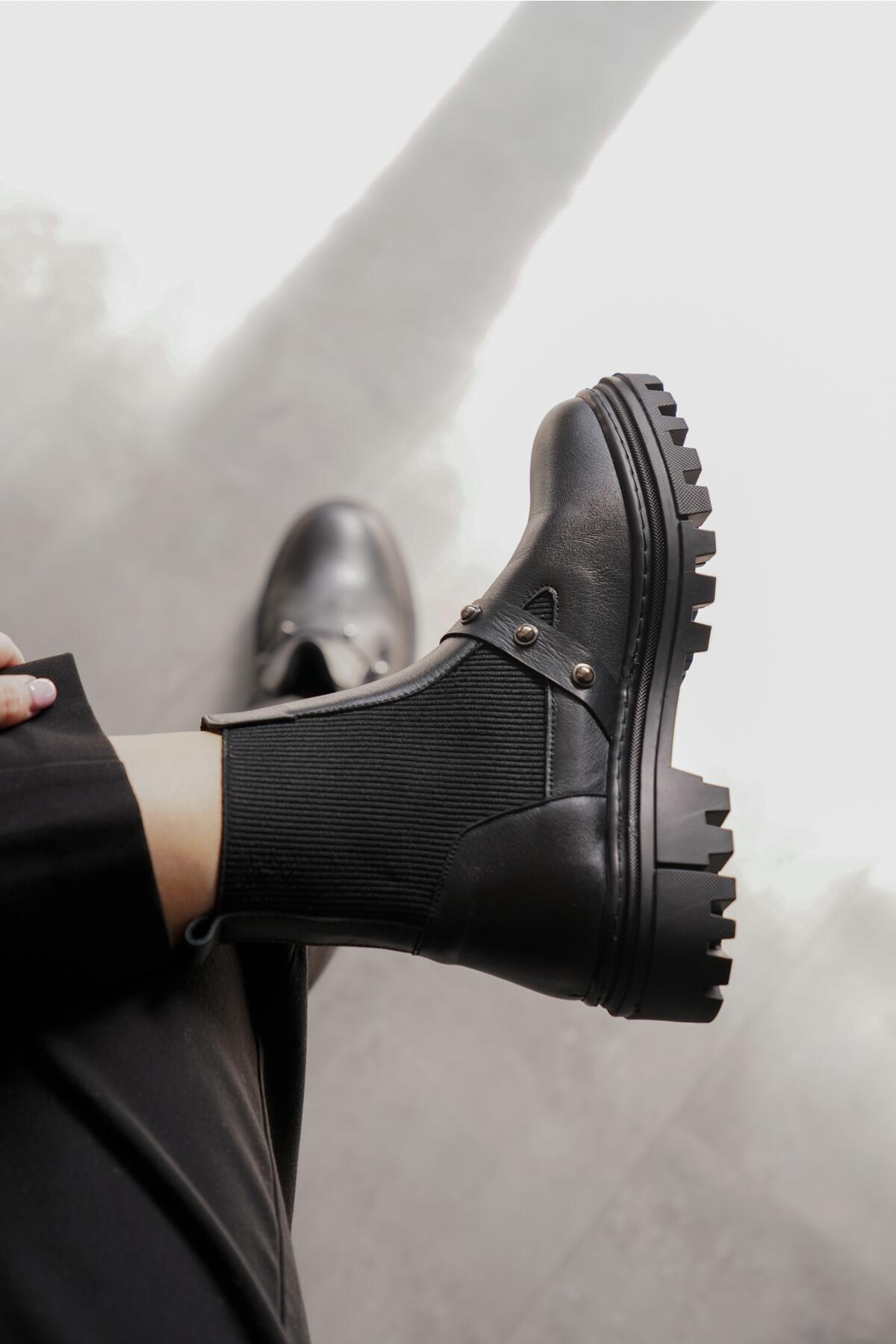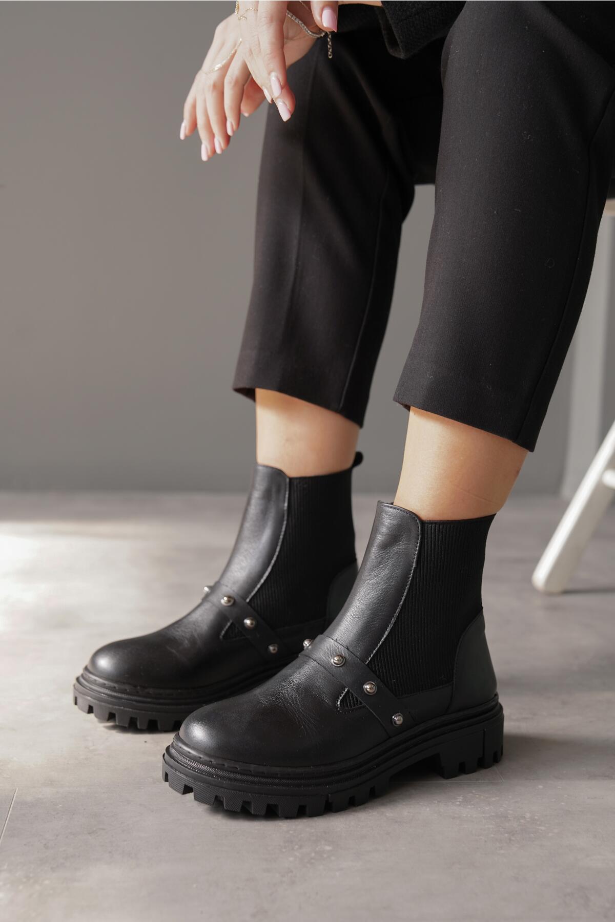 Kadın Zımba Detay Lastikli Hakiki Deri Düz Bot Trokie Siyah