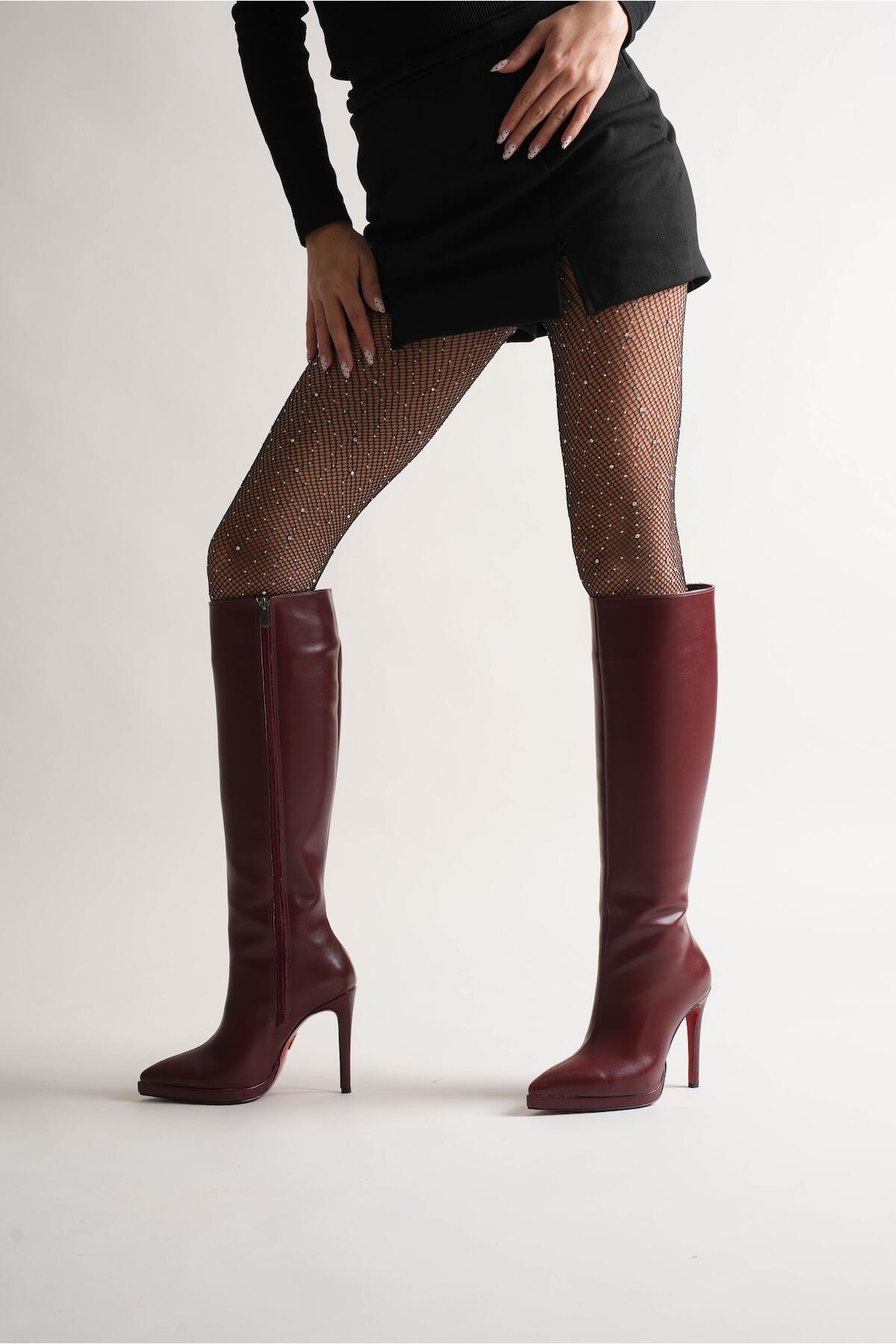 Kadın Diz Altı Kısa Platform Topuklu Çizme Amazen Bordo