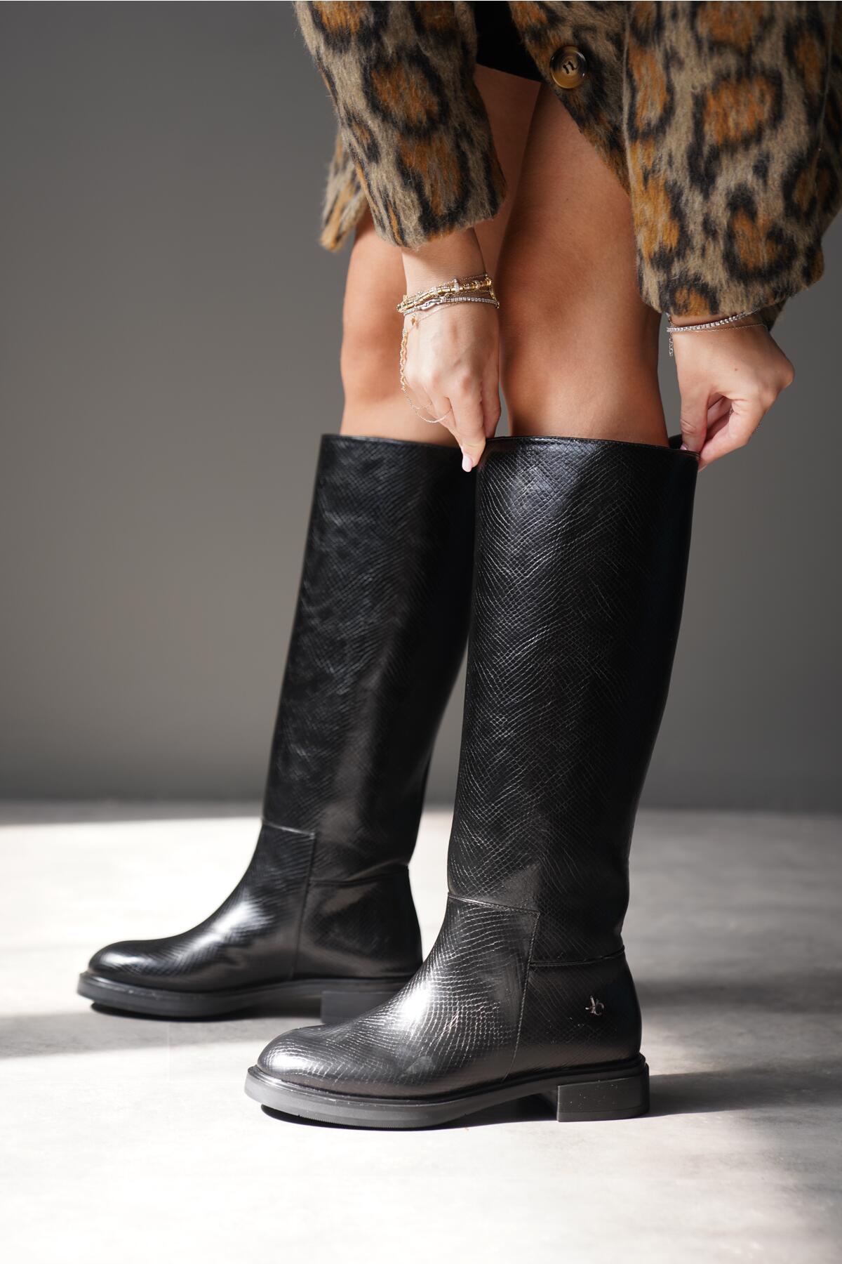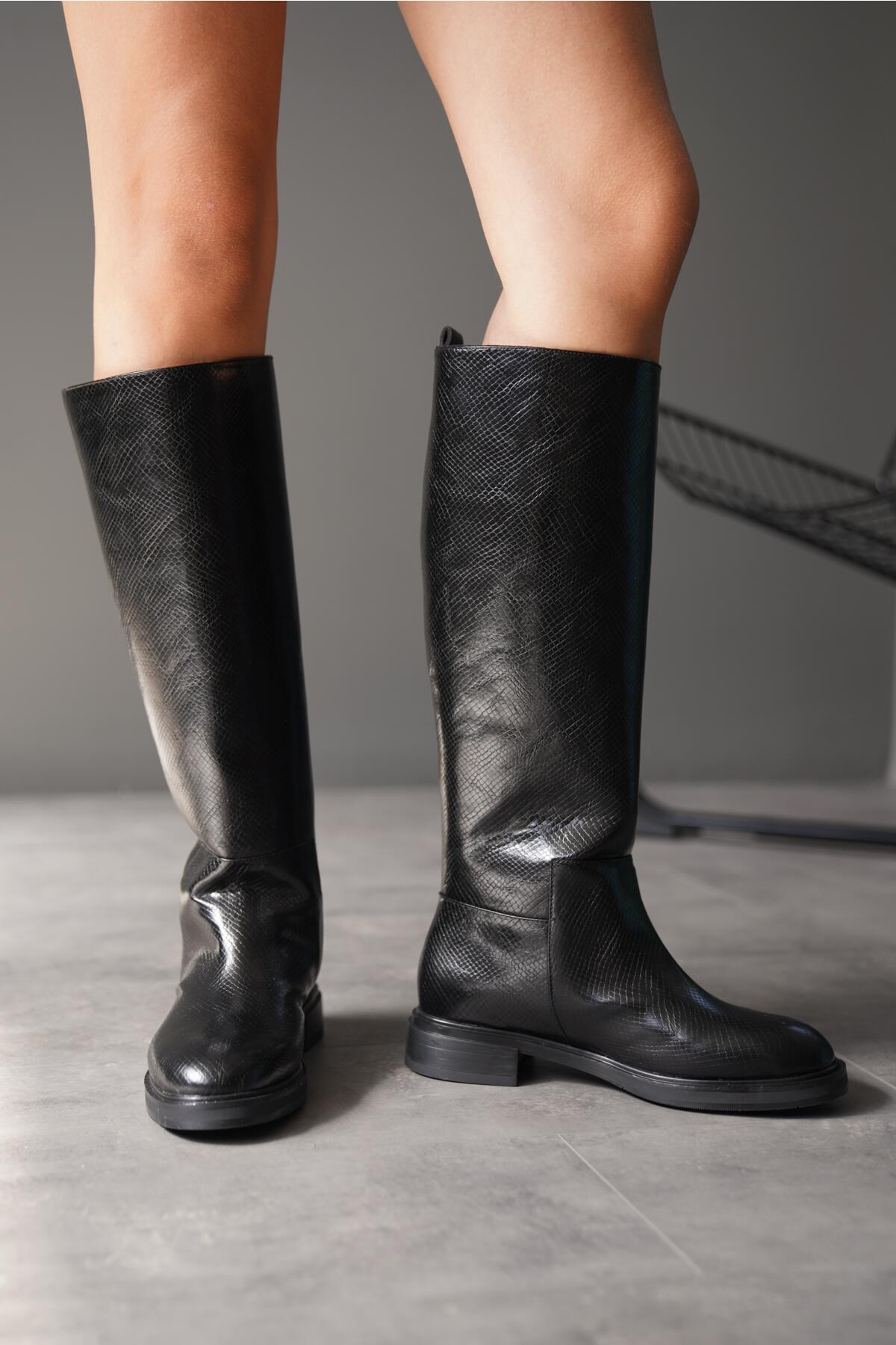Kadın Fermuarsız Düz Topuk Yılan Desenli Çizme Simla Siyah