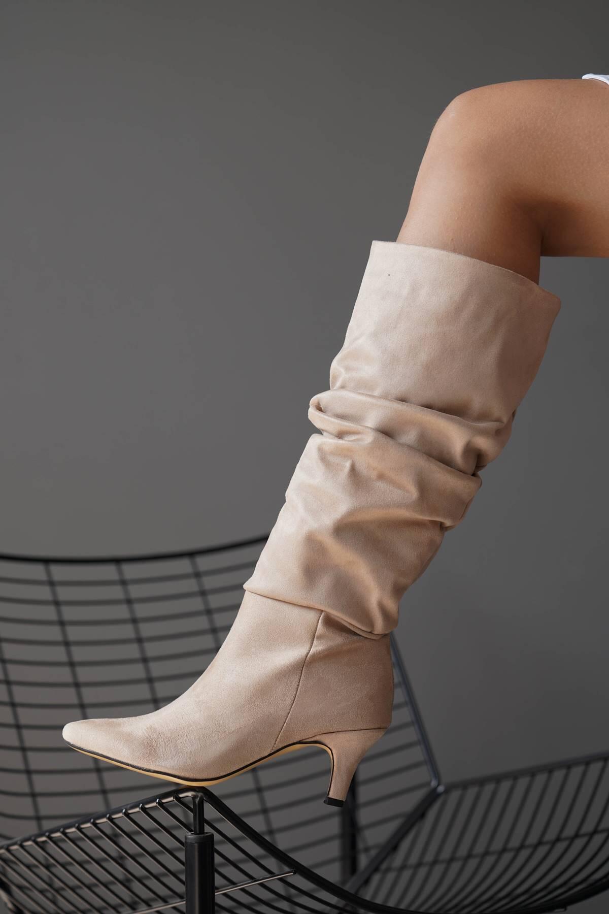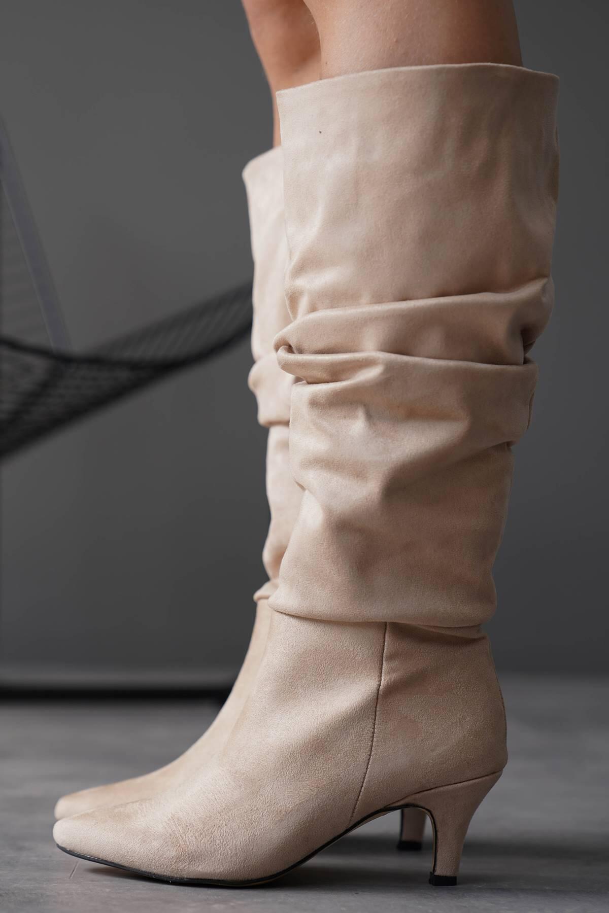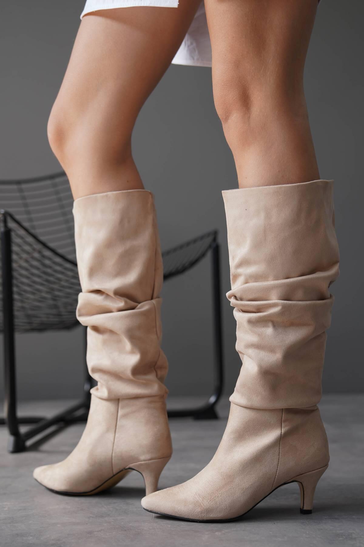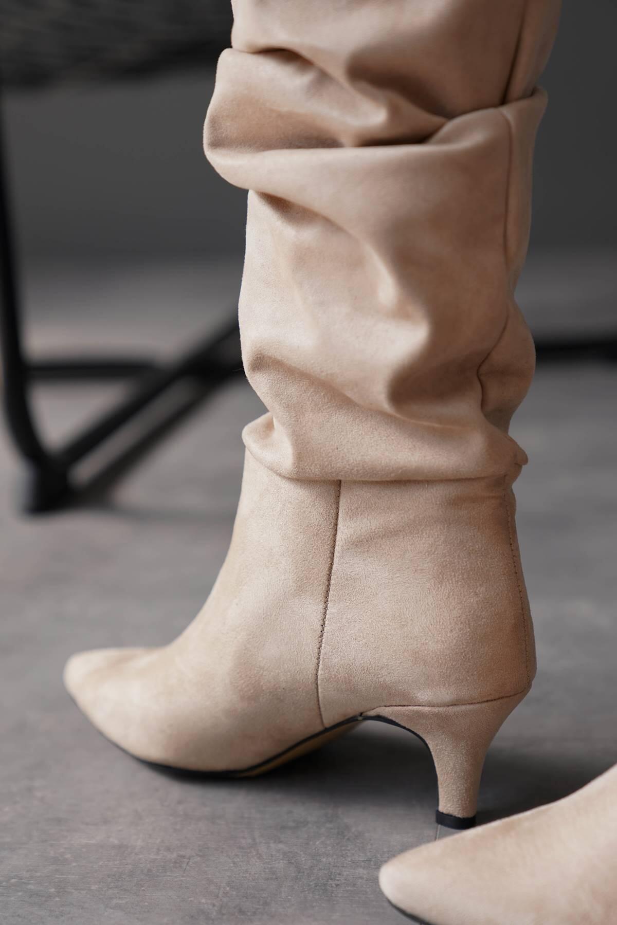 Kadın Kısa Topuk Diz Altı Çizme Korike Bej